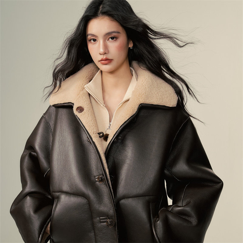 三福皮衣外套2025新款冬季复古宽松加绒保暖软皮衣夹克女装513300
