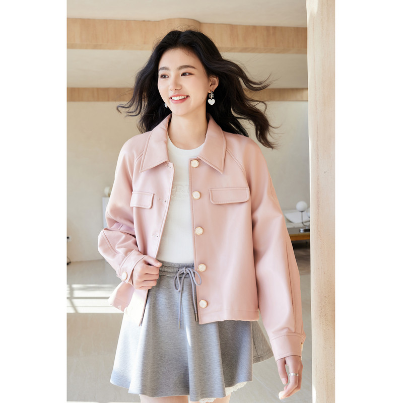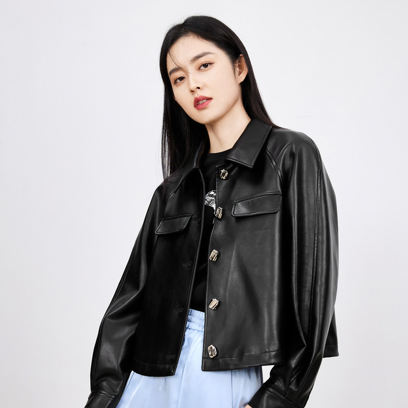太平鸟肌理荔枝纹PU皮衣外套女25年新款立体廓形夹克皮衣女