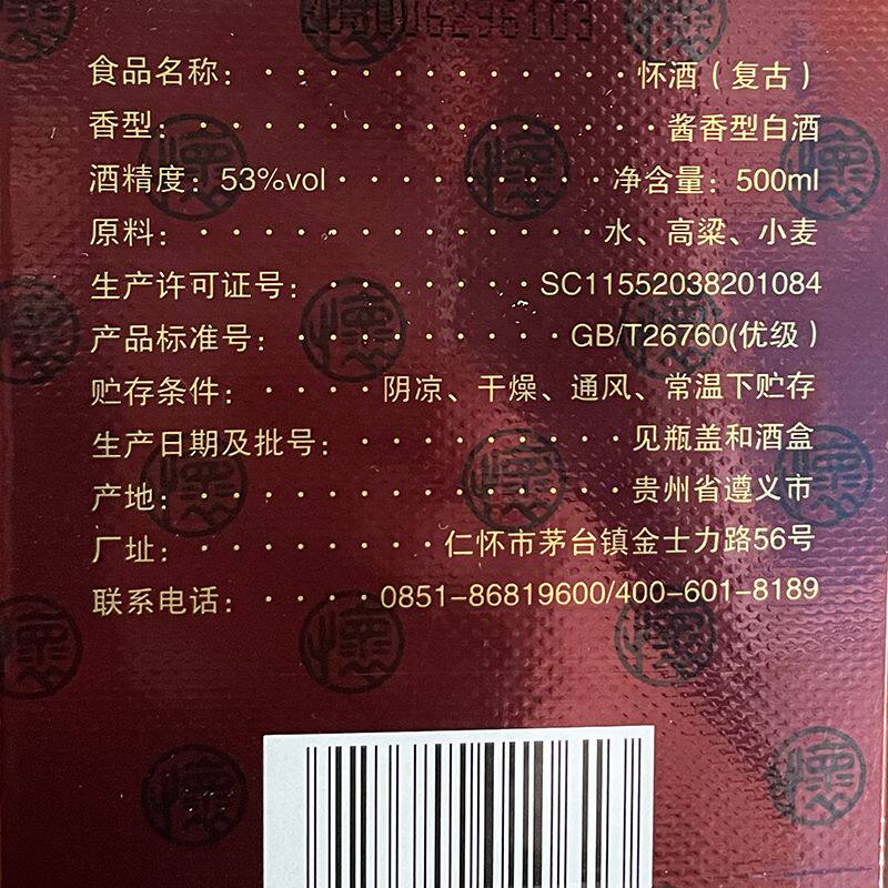 贵州名酒国台怀酒复古版,传承千年酱香工艺,精选赤水河畔优质红缨子高粱,采用传统“12987”坤沙酿造工艺,历经端午制曲、重阳下沙、九次蒸煮、八次发酵、七次取酒,历时一年精心酿制,再经多年陶坛窖藏,成就醇厚丰满、回味悠长的经典酱香。53度黄金酒精度,酒体微黄透明,酱香突出,幽雅细腻,空杯留香持久。500ml×6瓶装,复古包装设计,彰显文化底蕴与收藏价值。国台怀酒复古版,以纯粮固态发酵,零添加,品质纯正,是宴请宾朋、礼赠亲友、自饮品鉴的上乘之选,尽展酱香白酒的匠心魅力。