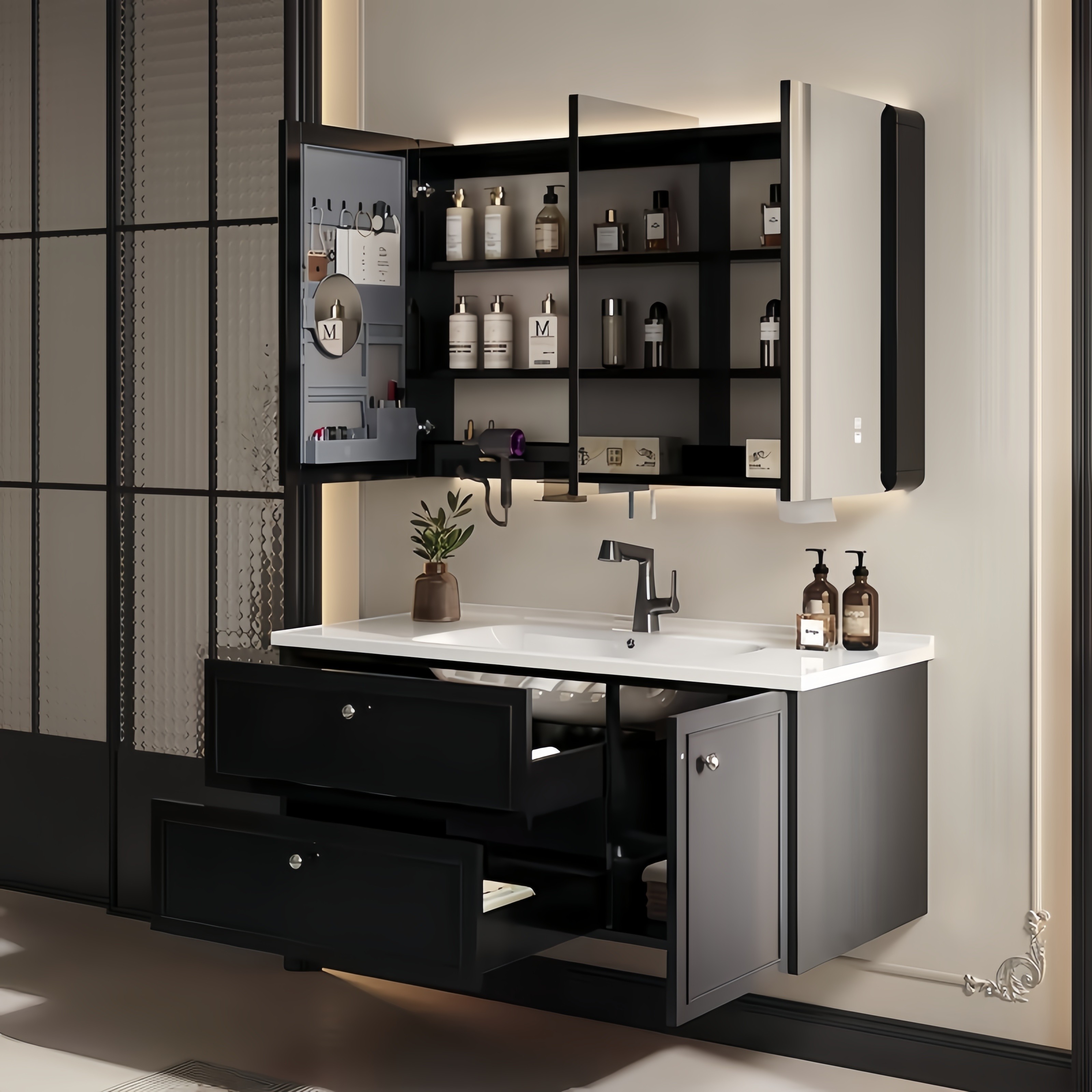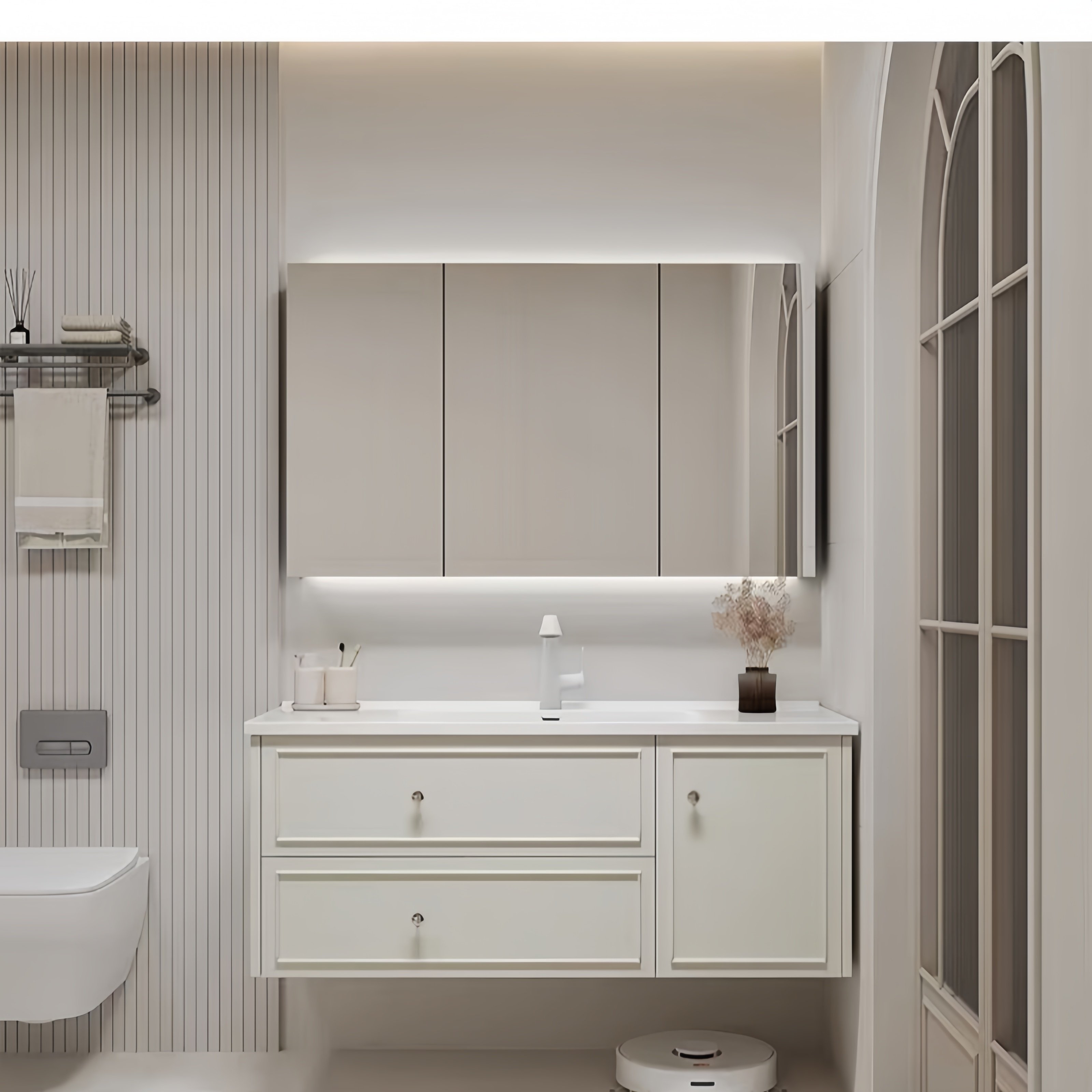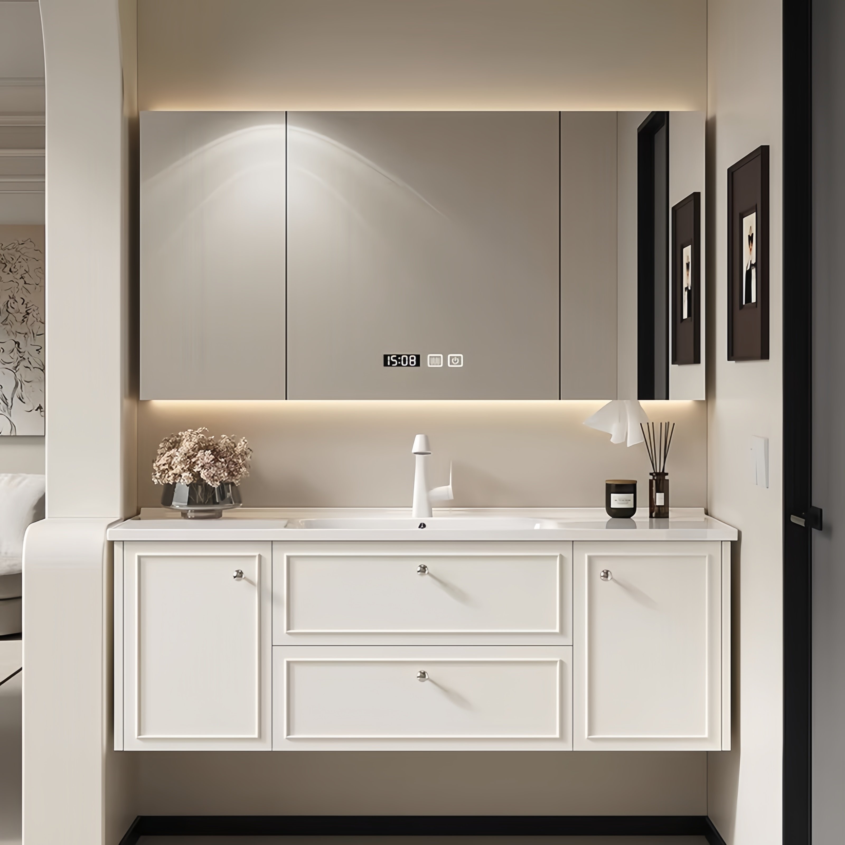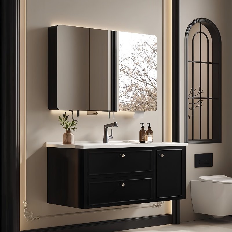 这款轻奢现代简约法式风智能镜浴室柜,融合法式优雅与现代极简美学,打造高品质卫浴空间。柜体采用环保材质,搭配陶瓷一体岩板洗脸盆,触感温润、坚固耐用且易于清洁。岩板台面抗污耐磨,搭配流畅线条设计,彰显低调奢华。智能镜内置LED照明、防雾功能及触控开关,提升使用便捷性与科技感。整体设计注重细节与实用性,收纳空间合理,满足日常洗漱需求。适用于现代住宅、精品酒店等场景,兼顾美观与功能,为卫生间注入艺术气息与智能体验,是追求品质生活的理想之选。