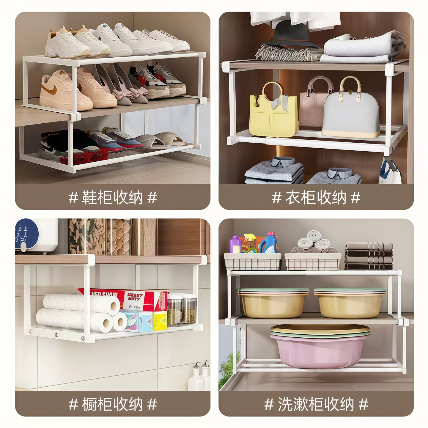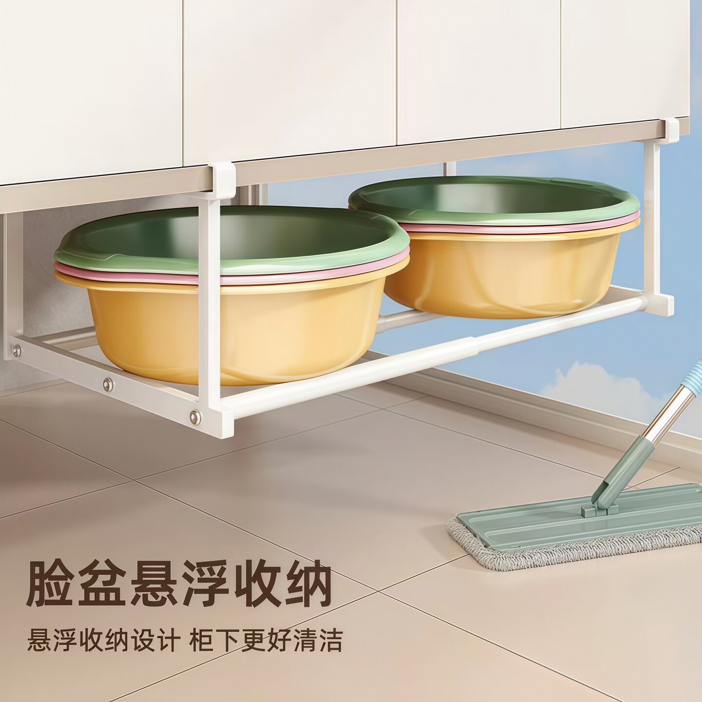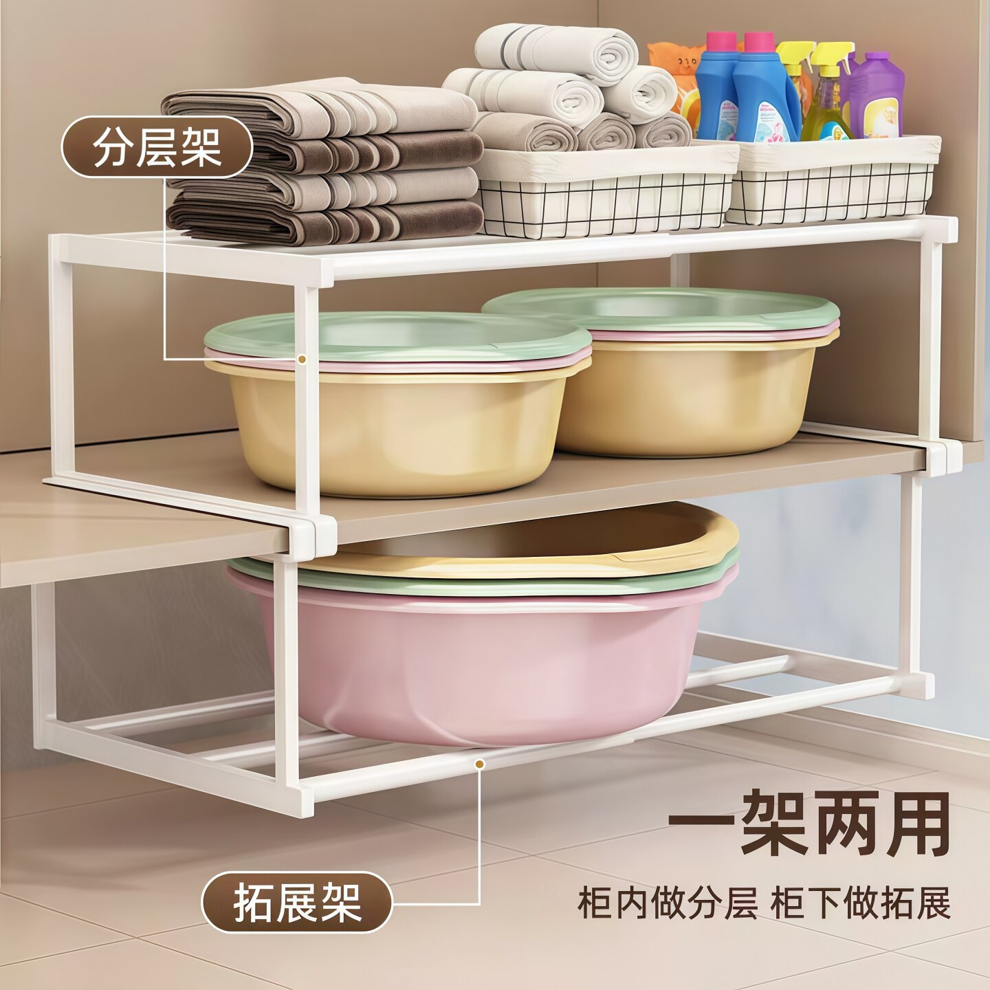 淘可伸缩分层脸盆隔板下挂篮免打孔家用加高柜鞋架易安装浴室置物架