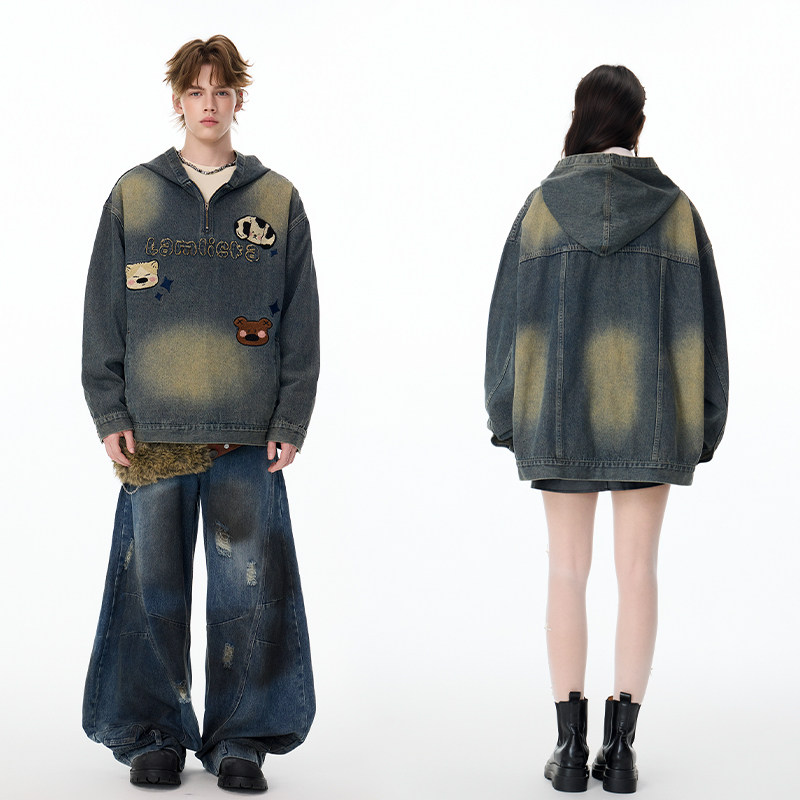 阿于呆秋冬日系假两件水洗连帽牛仔外套男宽松休闲情侣工装夹克女