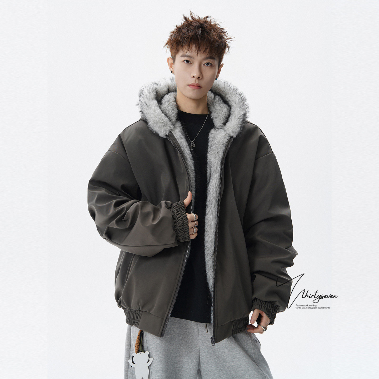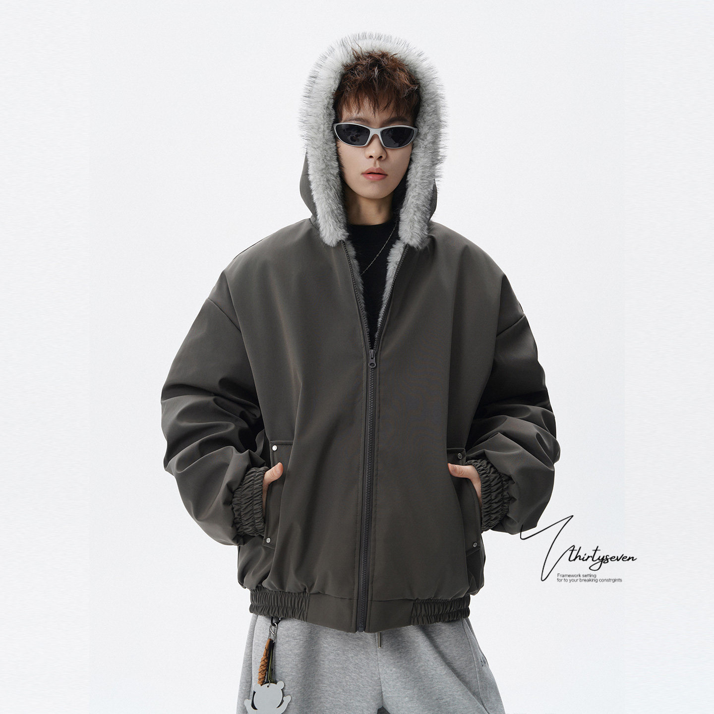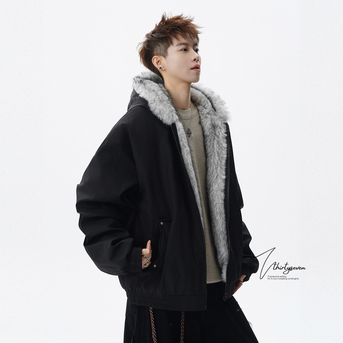 天猫V37美式高级感仿貂毛座山雕外套男冬潮牌痞帅大毛领连帽夹克棉服
