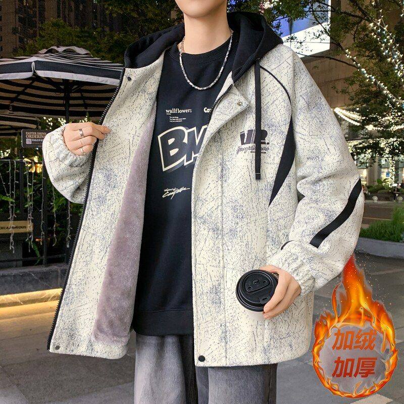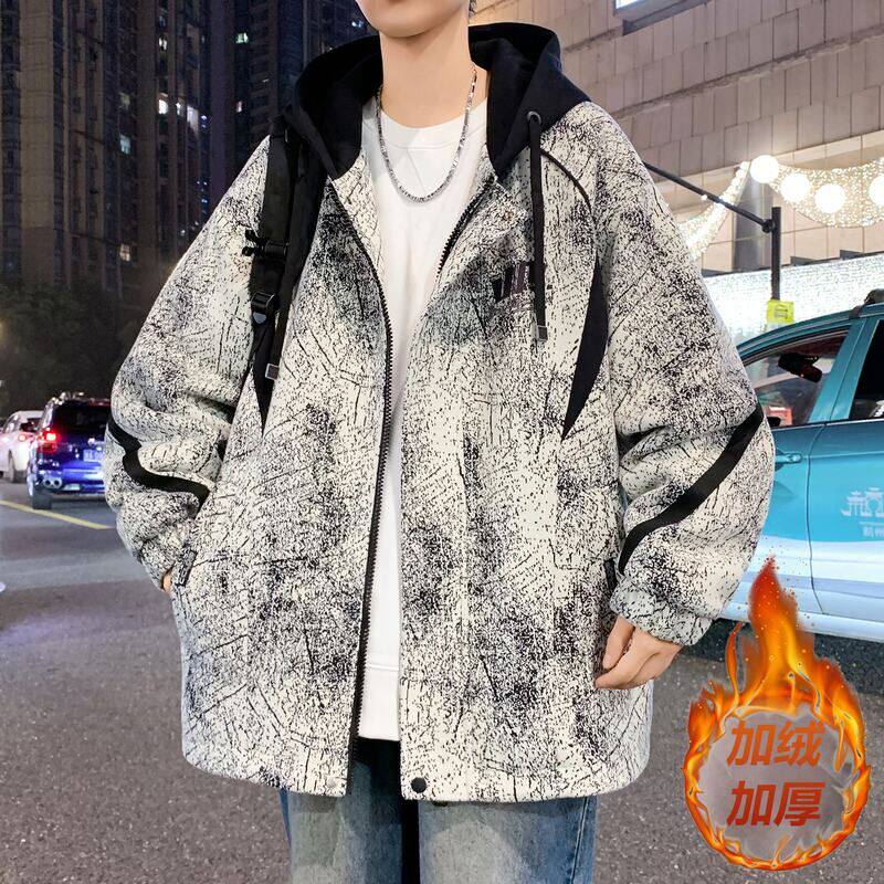 美式复古扎染麂皮绒夹克男秋冬加棉加厚保暖棉衣外套冬装潮流上衣