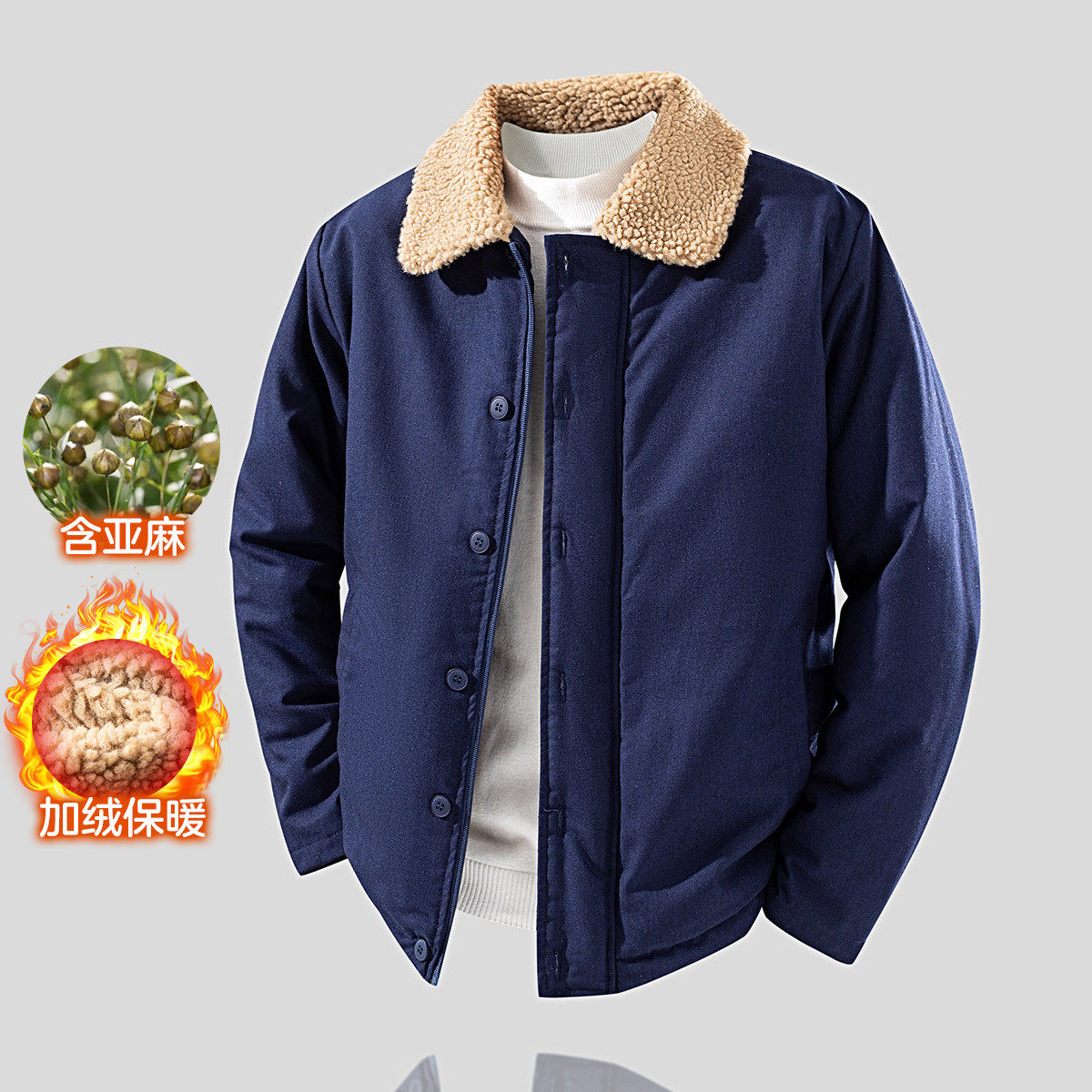 淘宝罗蒙含亚麻秋冬仿羊羔绒毛领加绒夹克男夹棉翻领棉衣棉服时尚外套