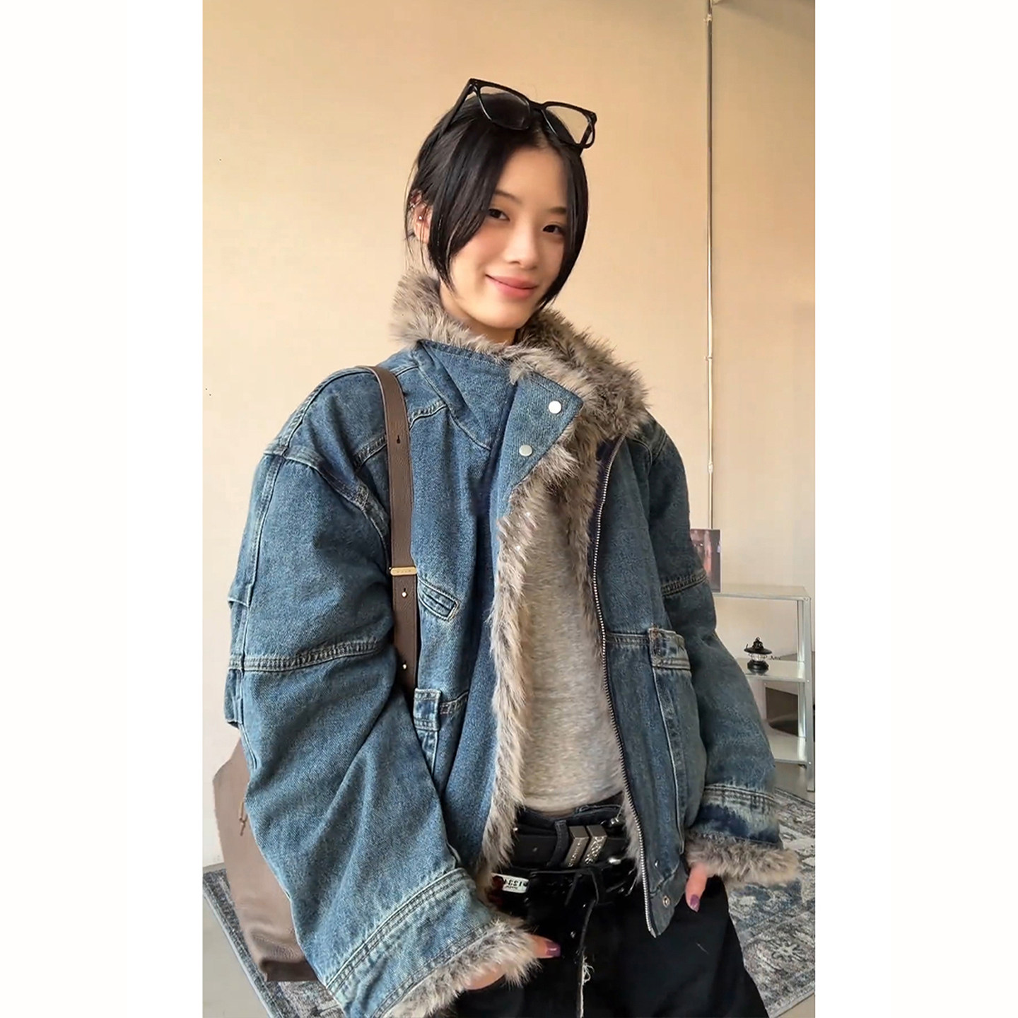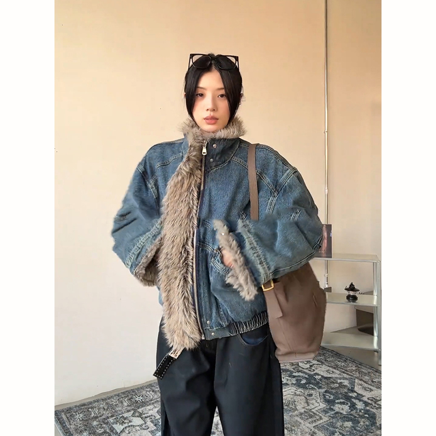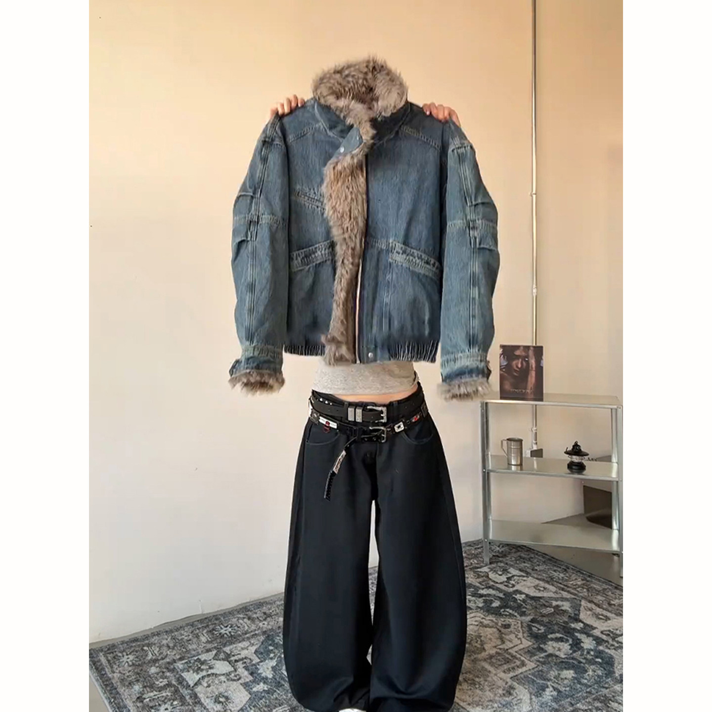 天猫水洗解构复古牛仔座山雕棉服外套男款冬季短款加厚高级感毛领棉衣