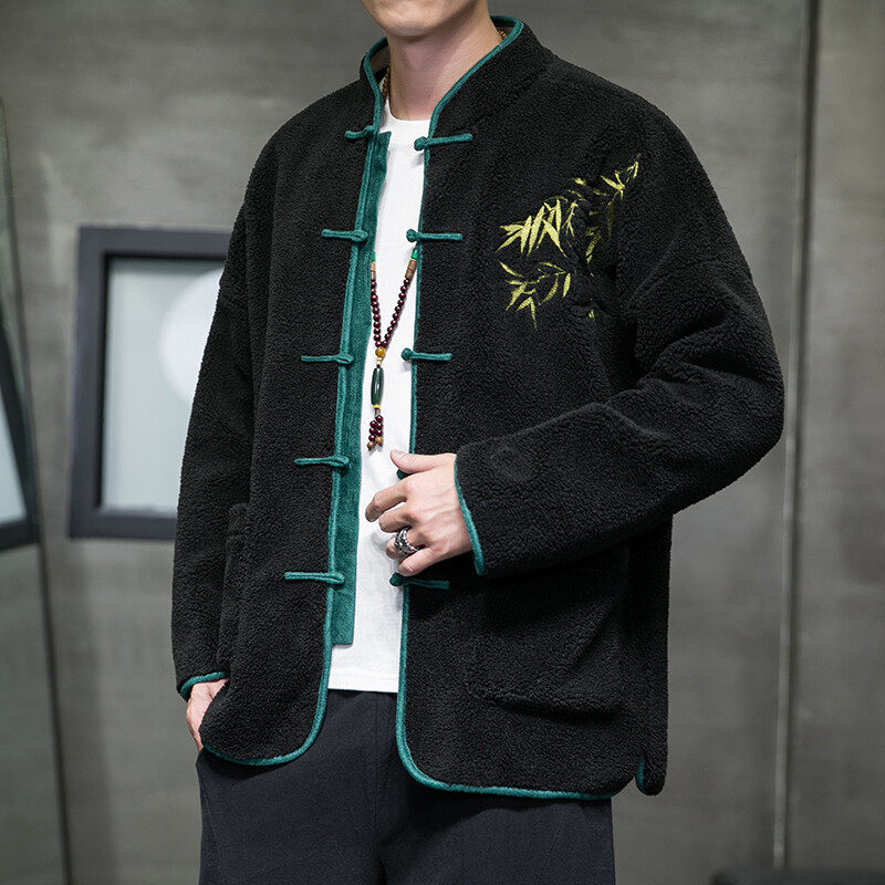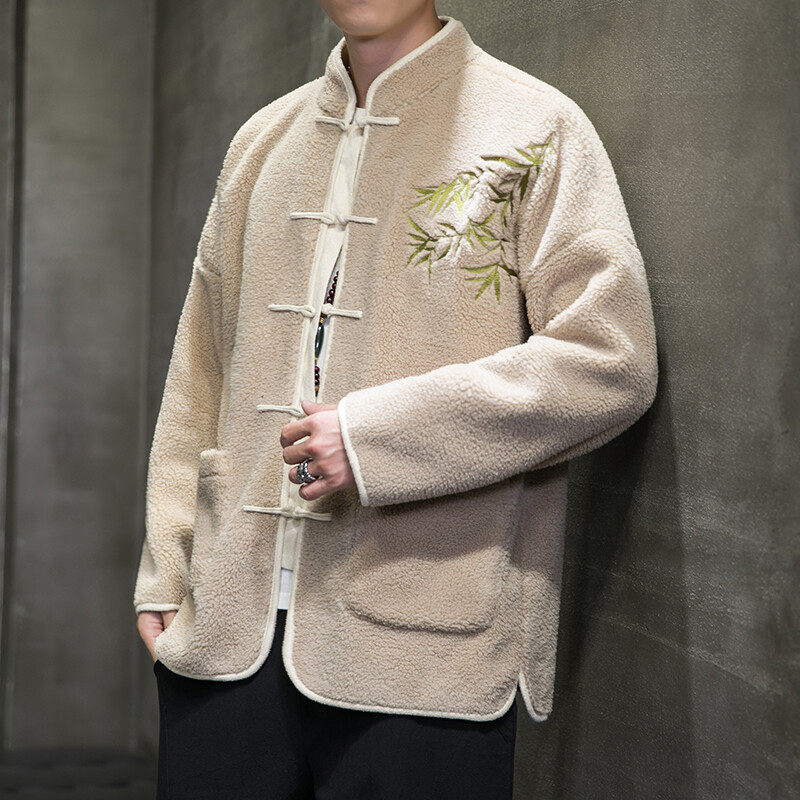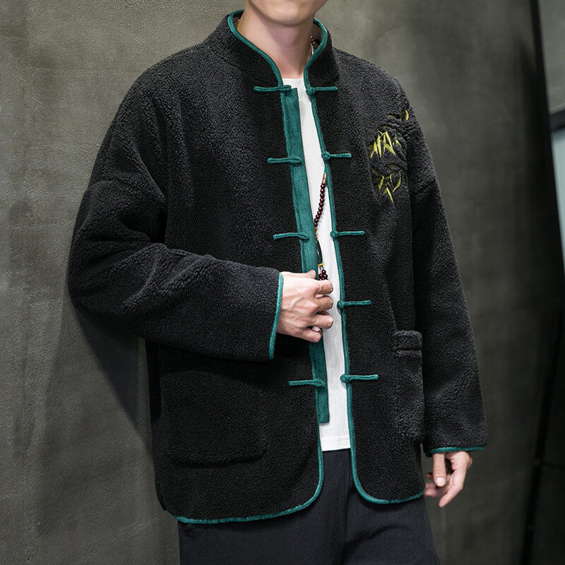 天猫中国风羊羔毛棉衣男秋冬季复古立领盘扣刺绣唐装外套加绒加厚保暖