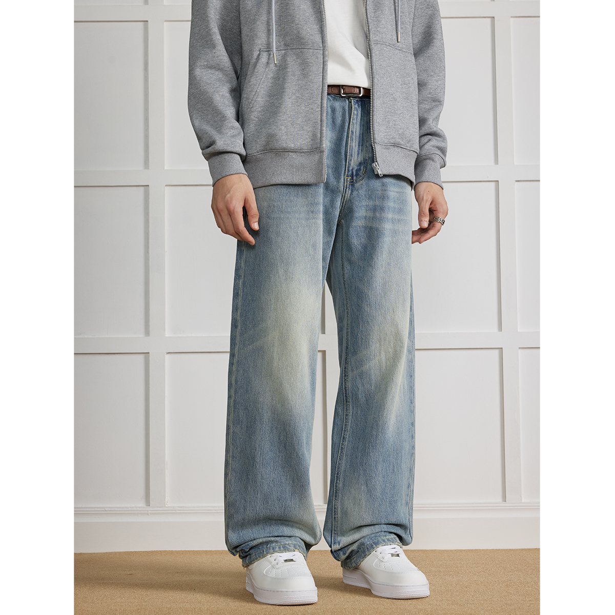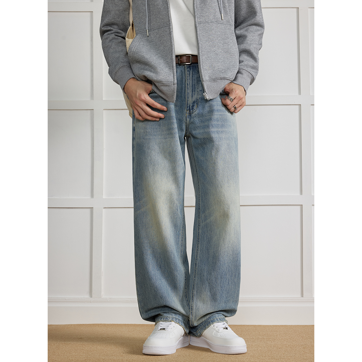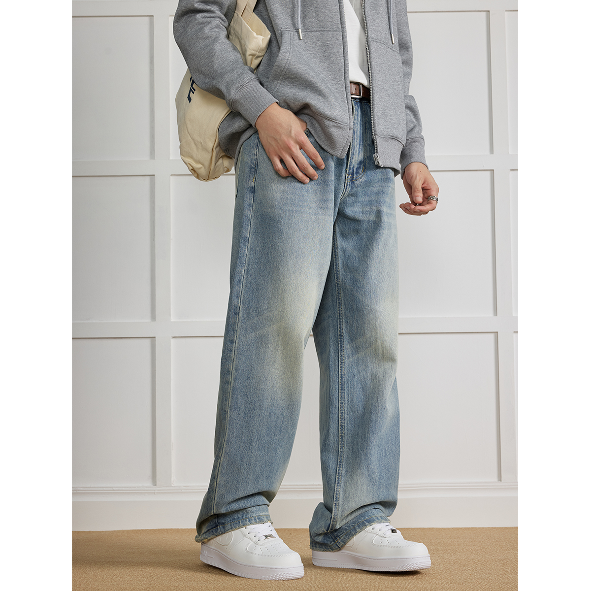 马登工装美式复古丹宁水洗牛仔裤直筒中腰锥形宽松哈伦长裤子男秋