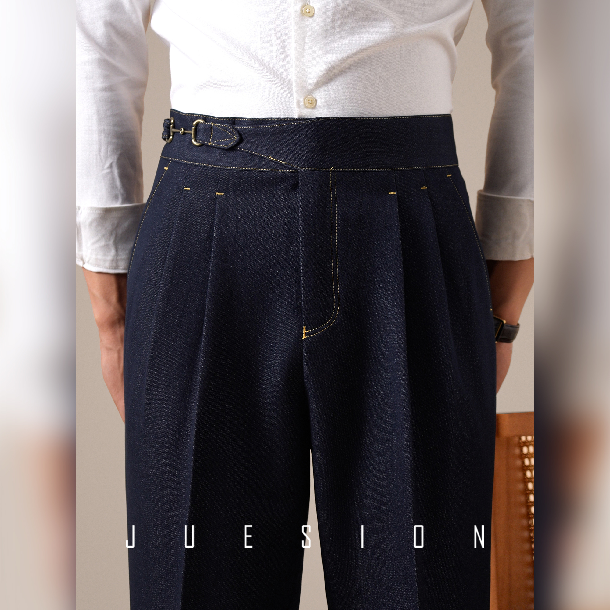 天猫JUESION 复古高腰牛仔裤男休闲商务百搭直筒长裤可调节廓尔格西裤