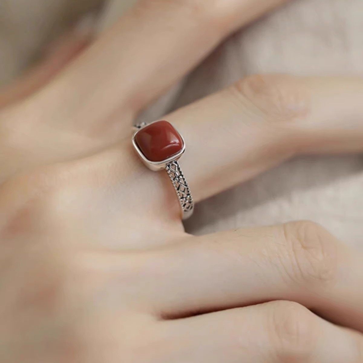 淘宝铜合金国潮中式复古宫廷风高级方糖红色复古小众镂空蕾丝戒指