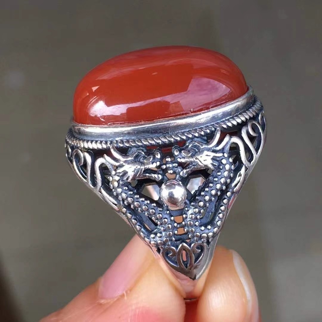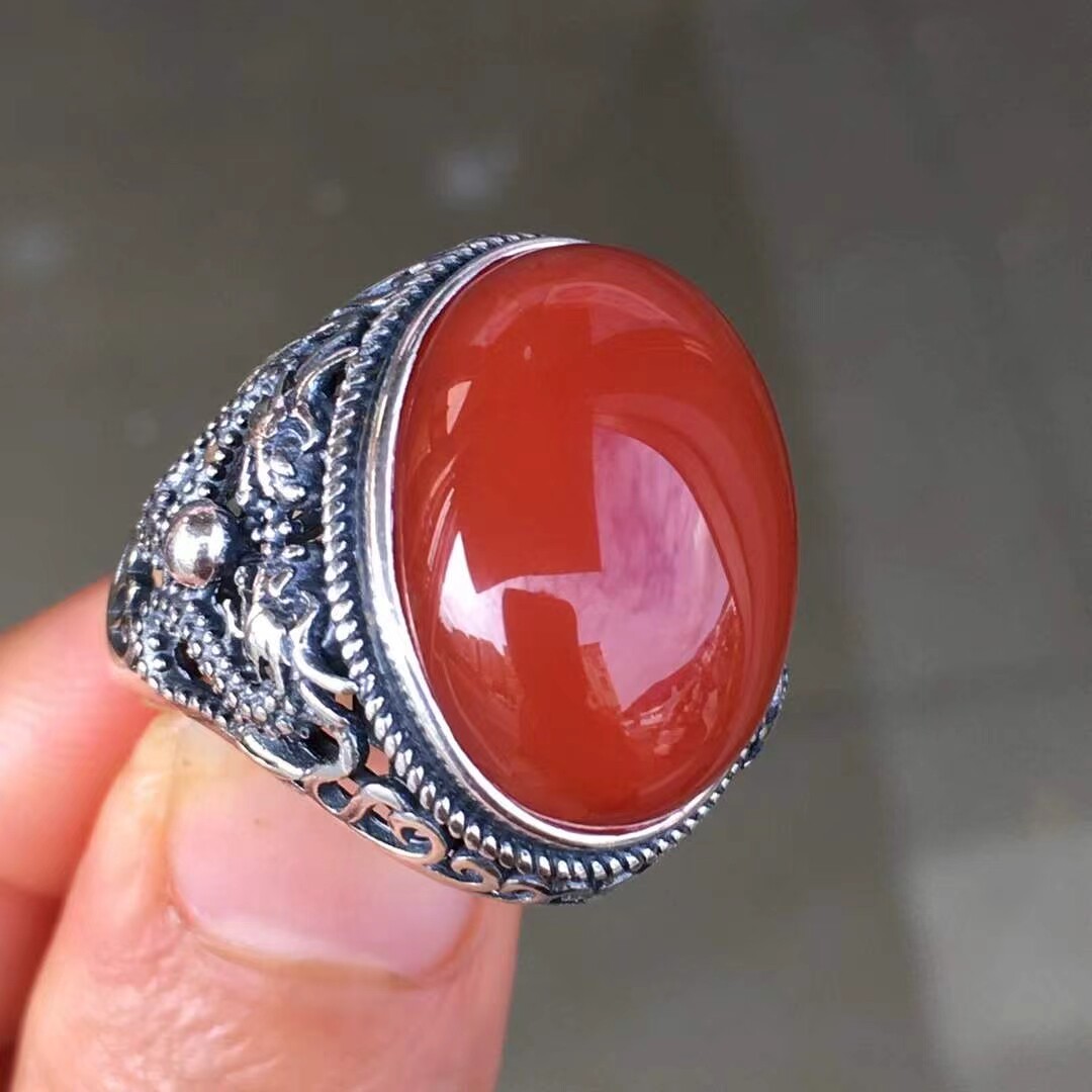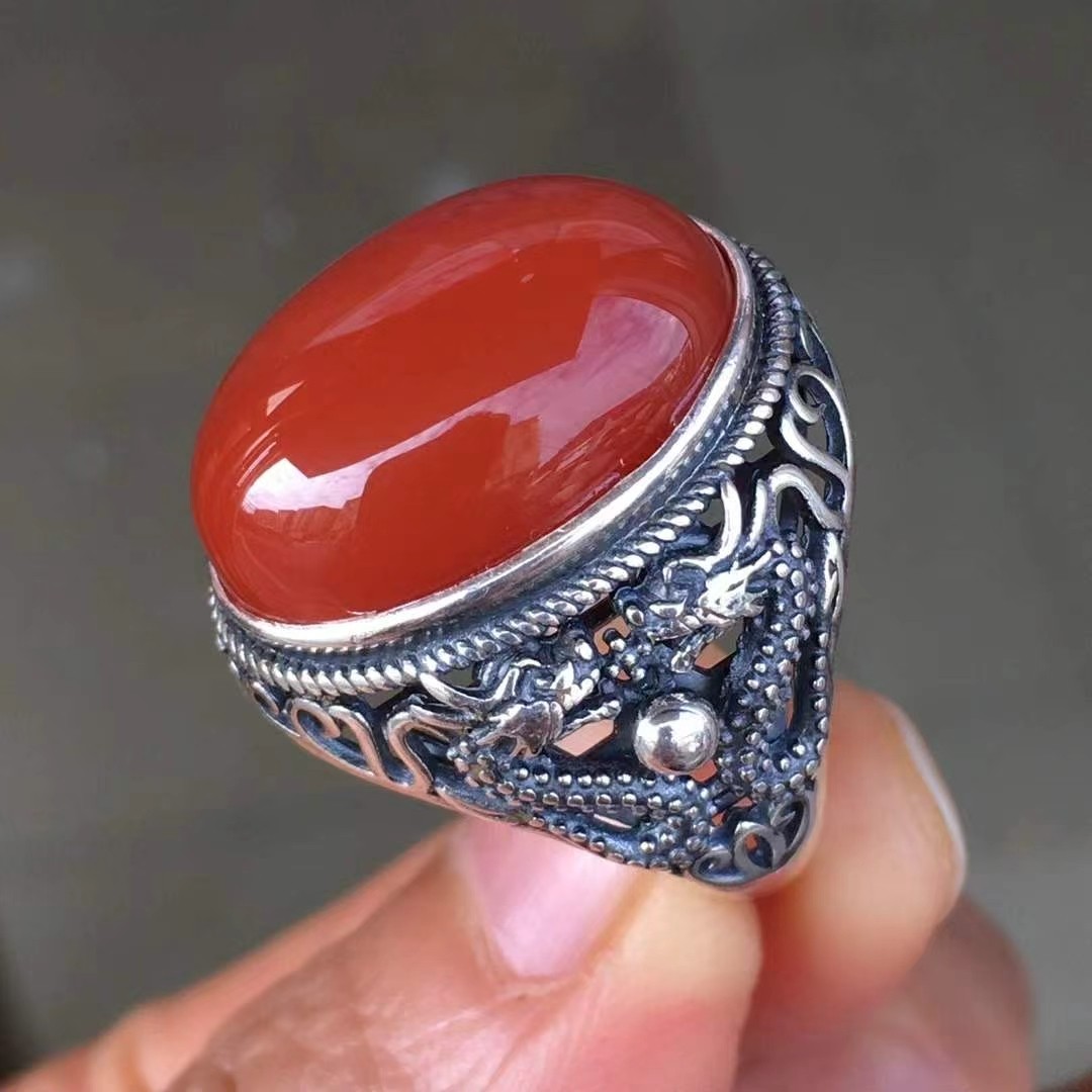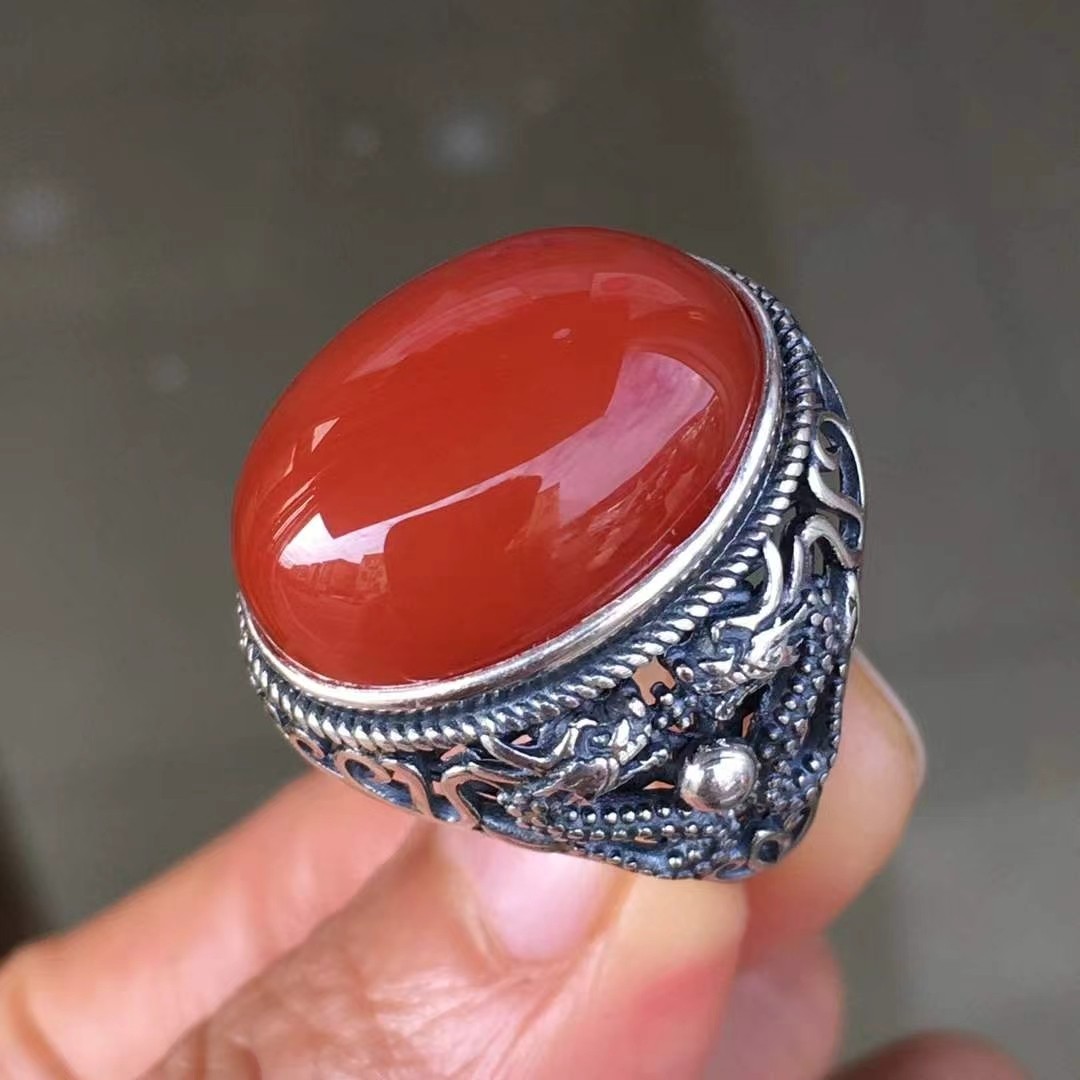 锦红南红玛c瑙蛋面镶嵌戒指男士复古霸气满肉s925银活口戒指小扳