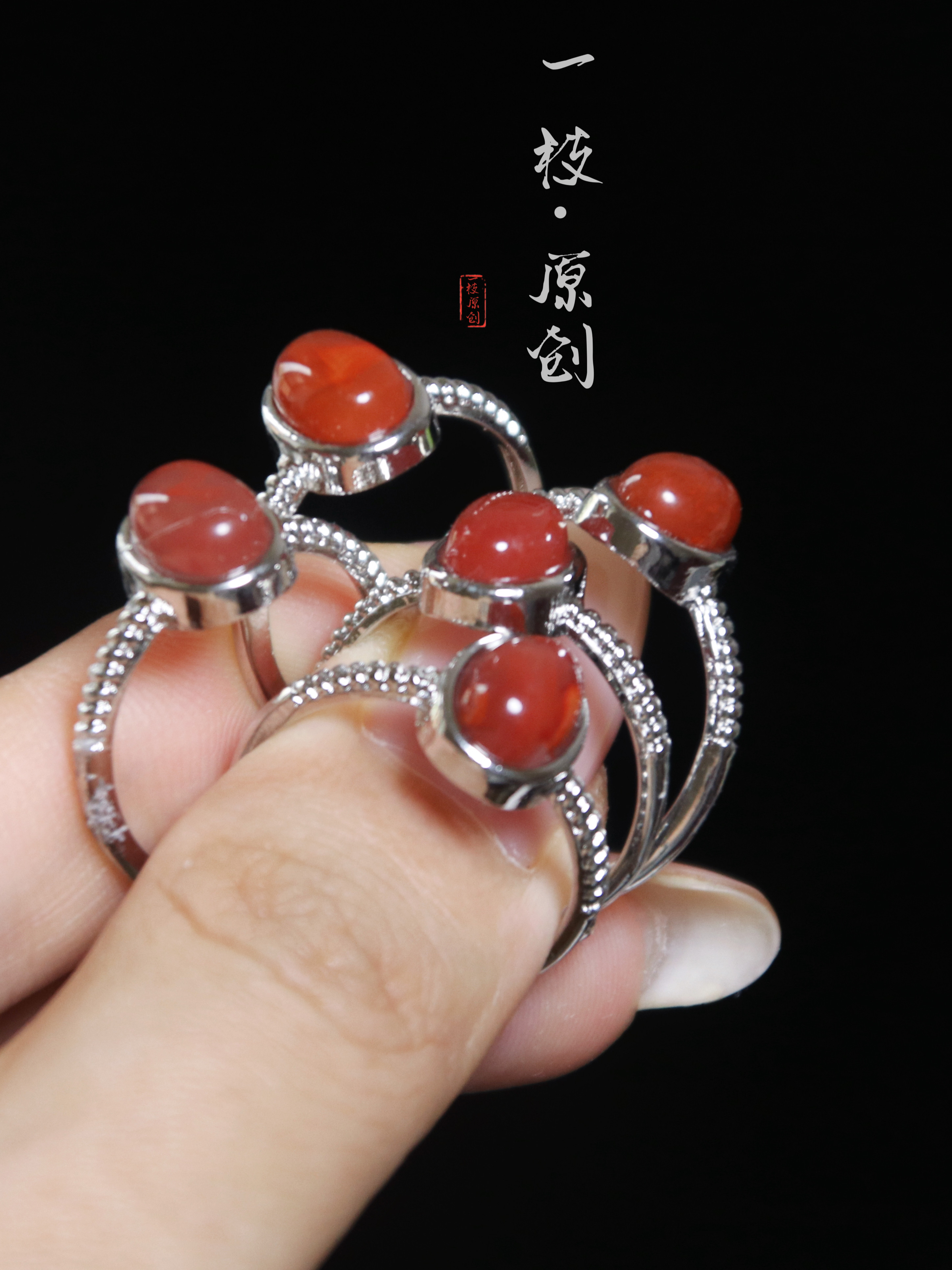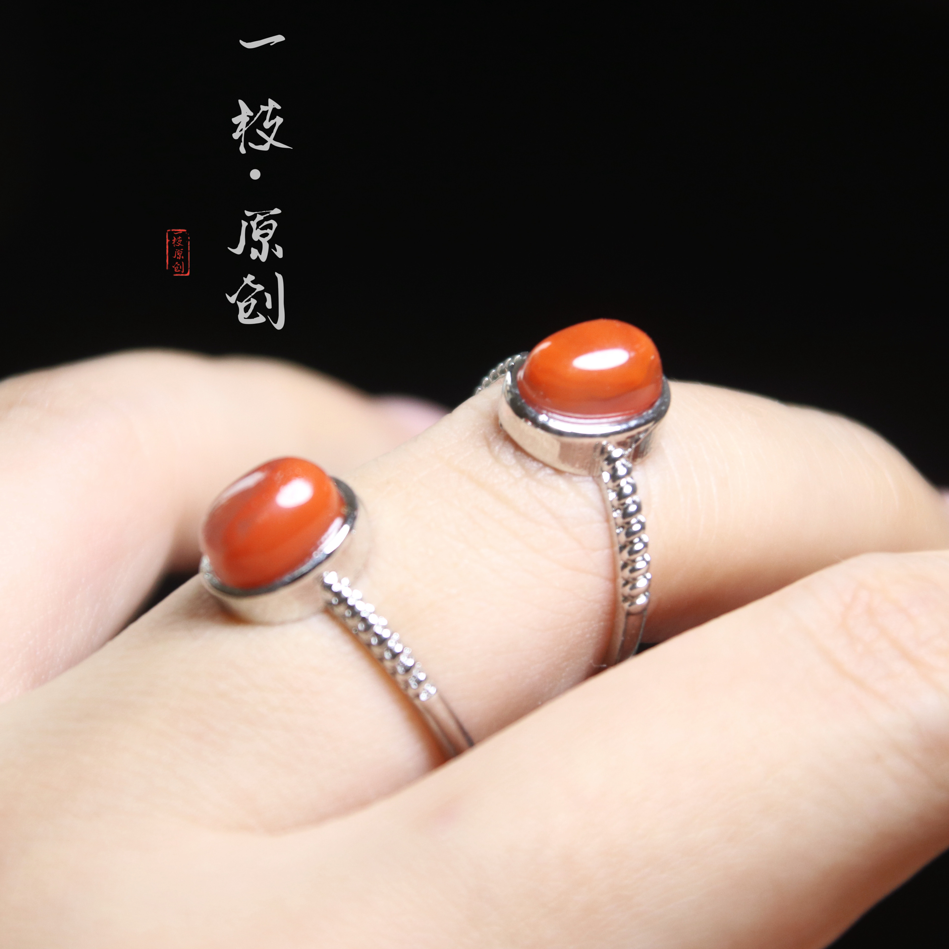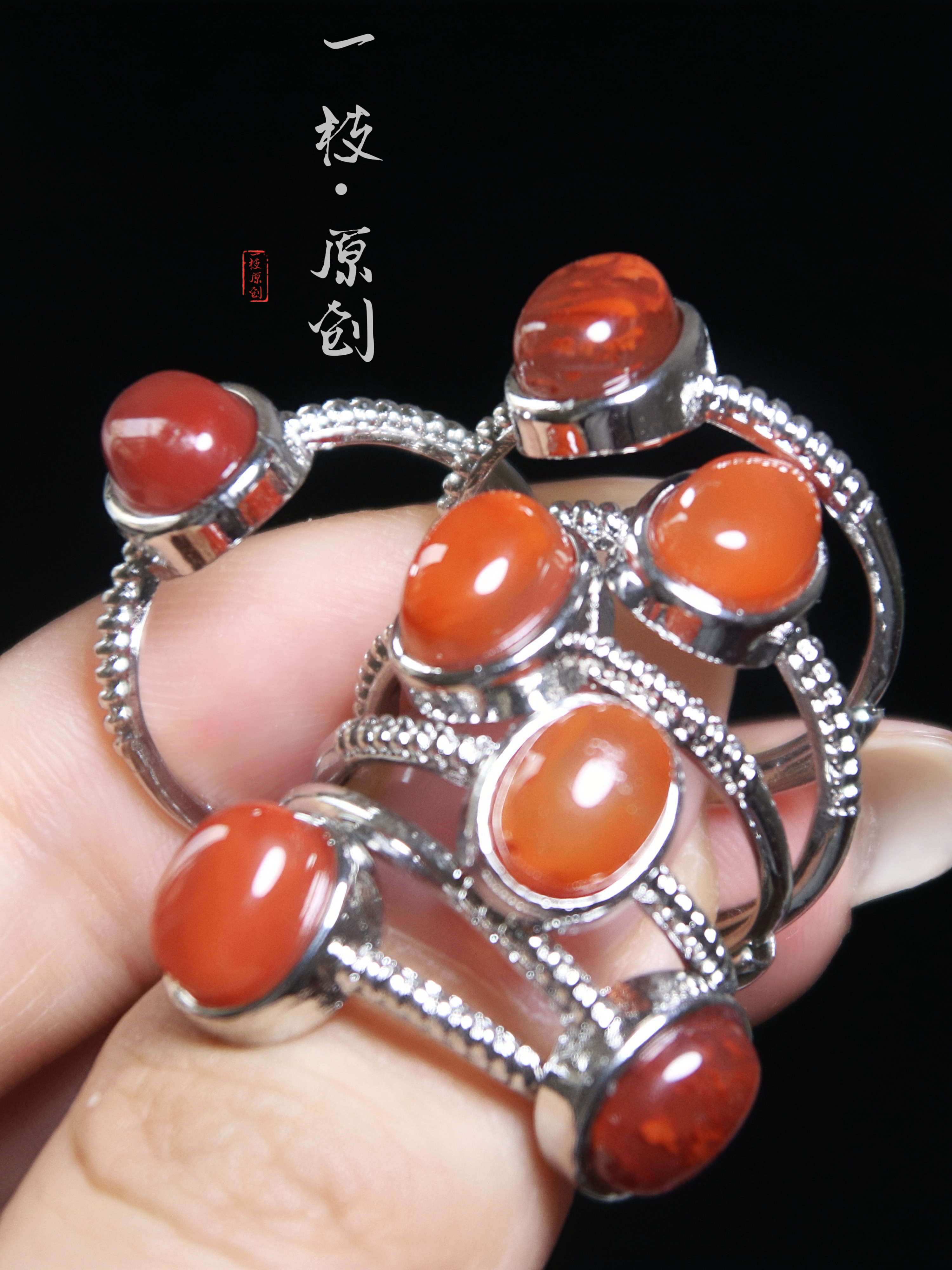 锦红南红玛c瑙蛋面镶嵌戒指男士复古霸气满肉s925银活口戒指小扳