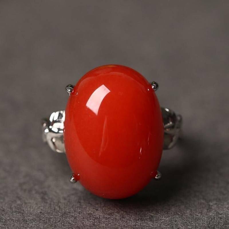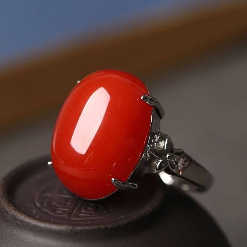 锦红南红玛c瑙蛋面镶嵌戒指男士复古霸气满肉s925银活口戒指小扳