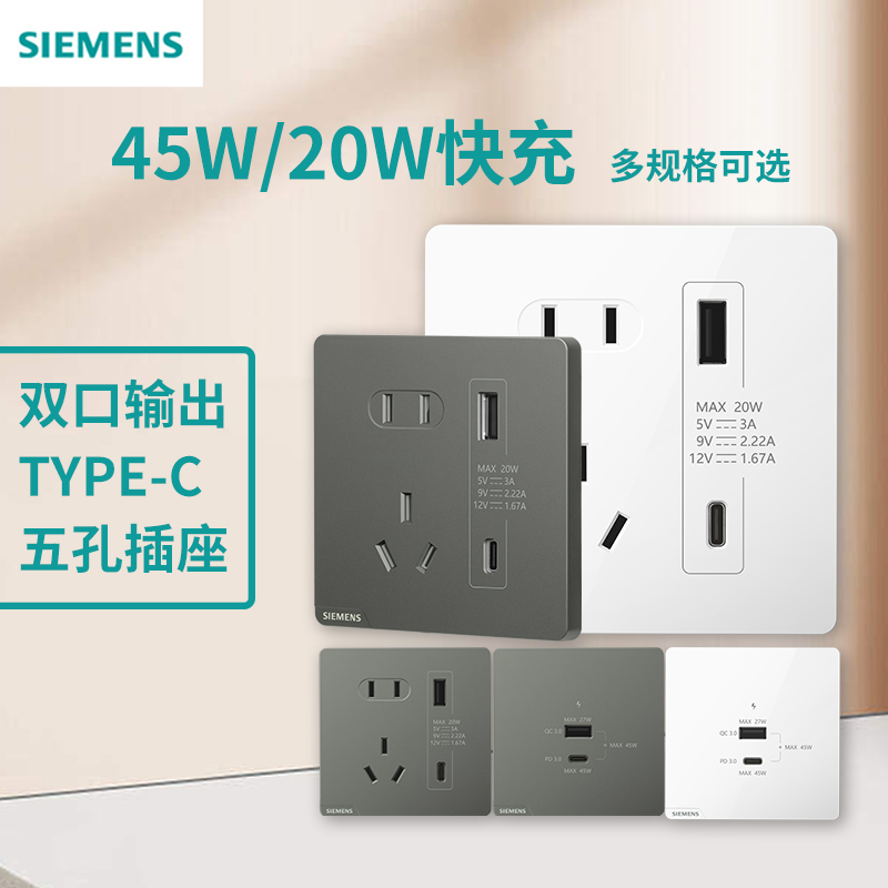淘宝西门子快充插座皓彩白银灰色86型墙壁(Type A+ C)usb智能手机充电