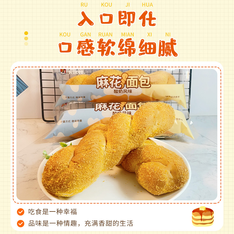 卡尔顿酸奶爆浆麻花面包是一款集美味与营养于一体的休闲早餐小食。外层采用酥脆麻花工艺,内里包裹浓郁酸奶夹心,咬一口瞬间爆浆,口感层次丰富,甜而不腻。精选优质面粉与天然酸奶,富含蛋白质与钙质,兼顾美味与健康,适合早餐、下午茶或随时充饥。独立小包装设计,方便携带,防潮保鲜。整箱装更实惠,适合家庭囤货、办公室分享或作为健康零食馈赠亲友。无论是搭配牛奶、咖啡,还是单独享用,都能带来满满的幸福感,是现代快节奏生活中理想的营养小吃选择。