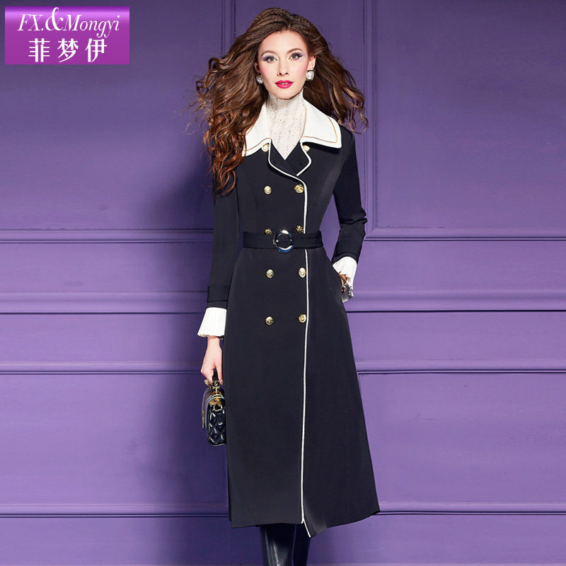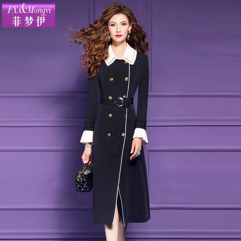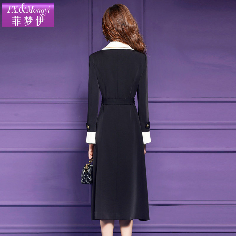 天猫菲梦伊黑色衬衫连衣裙女喇叭袖秋季新款赫本风收腰双排扣风衣外套