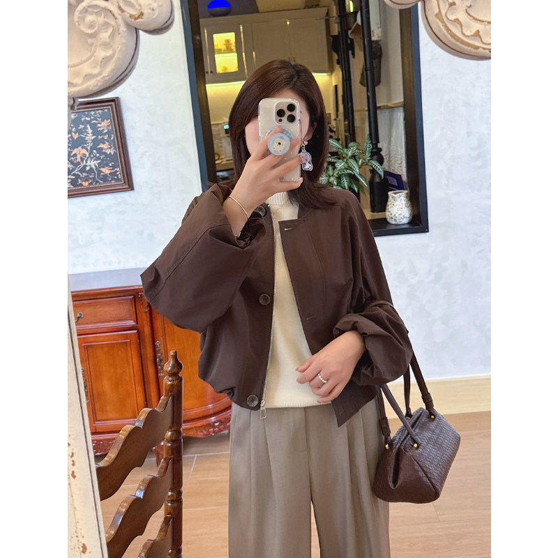 淘宝紫璐莱榛果巧~韩系简约风百搭休闲慵懒花苞袖短款风衣外套女026X