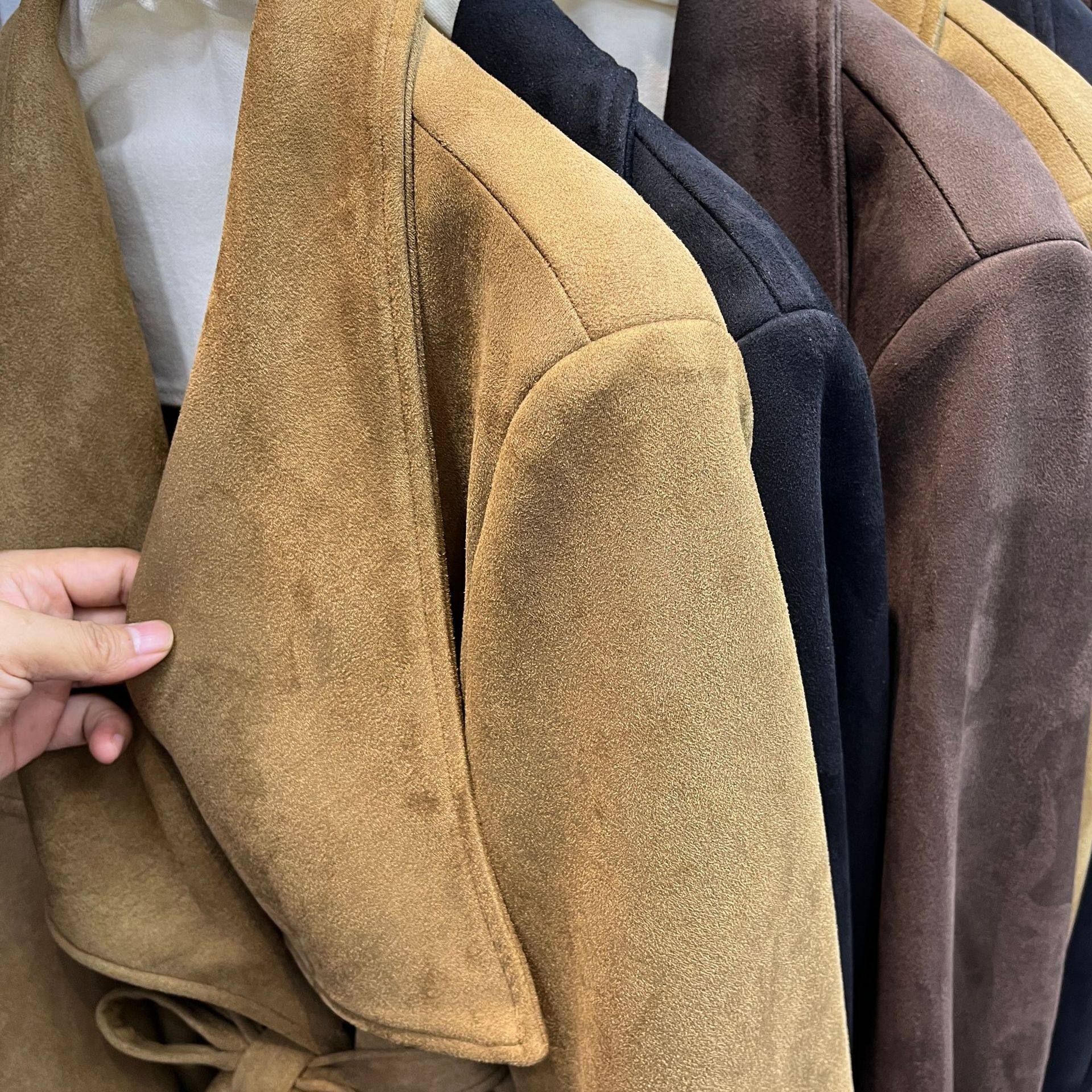 2025秋冬新款摩登女装韩版复古大翻领显瘦麂皮绒风衣,融合经典复古与现代时尚,打造优雅知性气质。采用高品质麂皮绒面料,触感柔软、垂坠有型,保暖又显高级。过膝长款设计拉长身形比例,搭配立体剪裁与微收腰线,轻松勾勒曼妙曲线,显瘦效果显著。标志性大翻领设计复古感十足,增添气场与层次感,适配通勤、约会等多种场合。多色可选,搭配大衣、针织或裙装皆宜,轻松穿出秋冬高级感。这款风衣不仅是温度的象征,更是品味的体现,为都市女性带来温暖与风尚兼具的穿搭体验。
