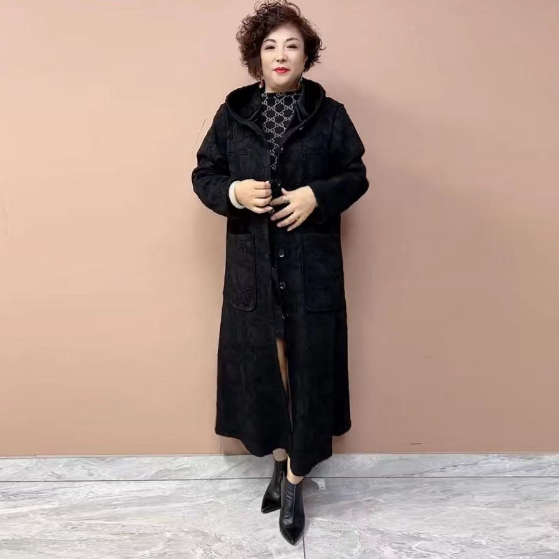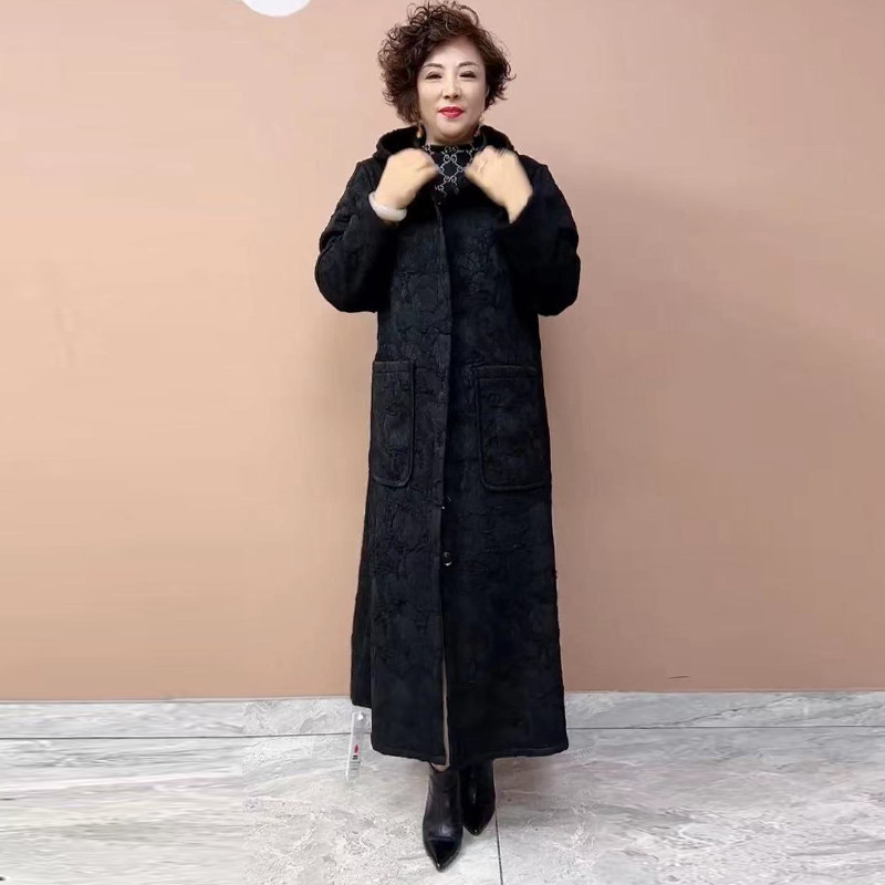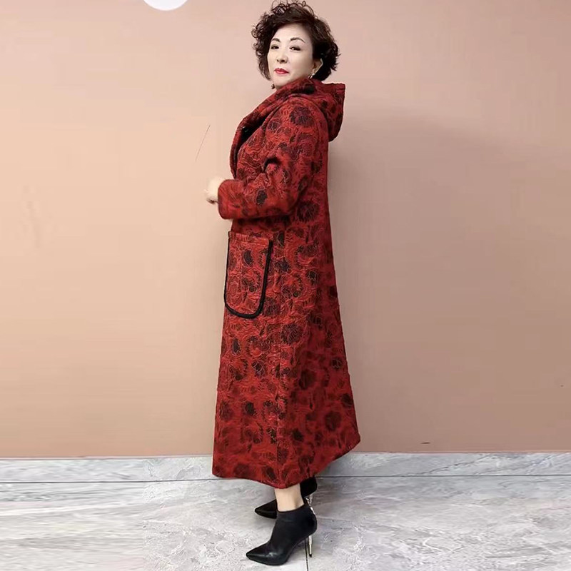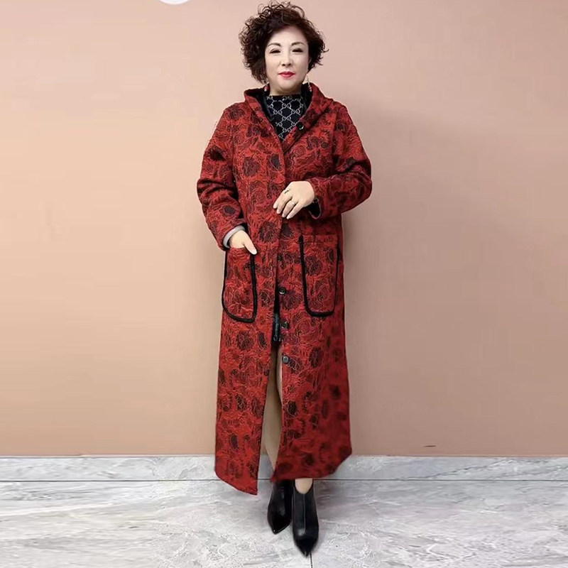 淘宝中老年妈妈装加绒加厚外套冬季保暖大衣连帽长款过膝女士大码风衣