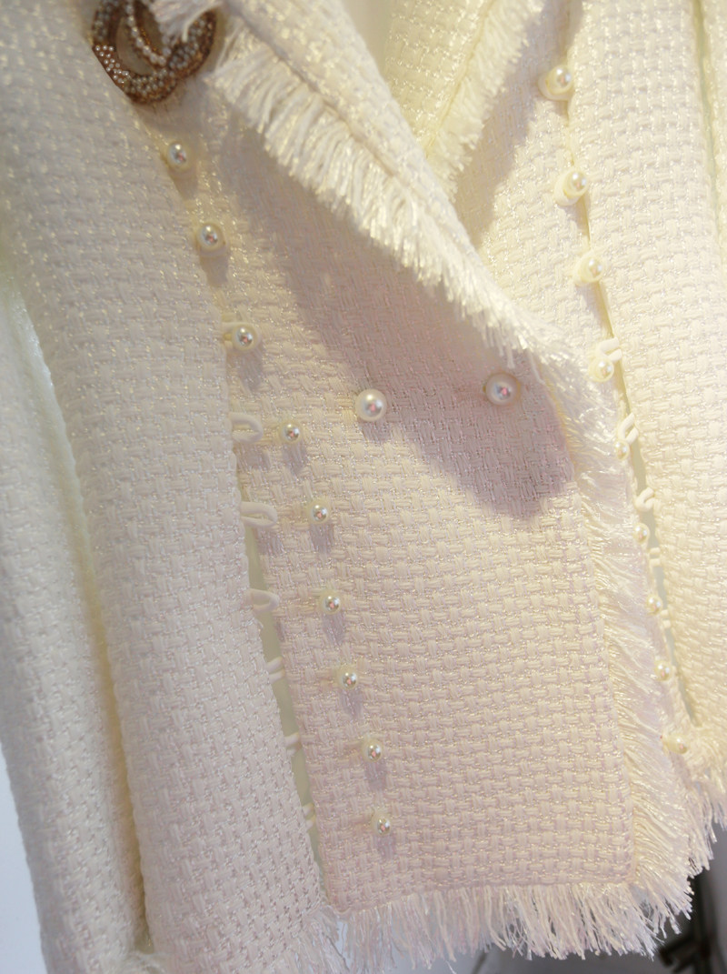 淘宝25秋冬白色小香风羊毛呢外套西装领女士风衣珍珠扣精品高档流苏C