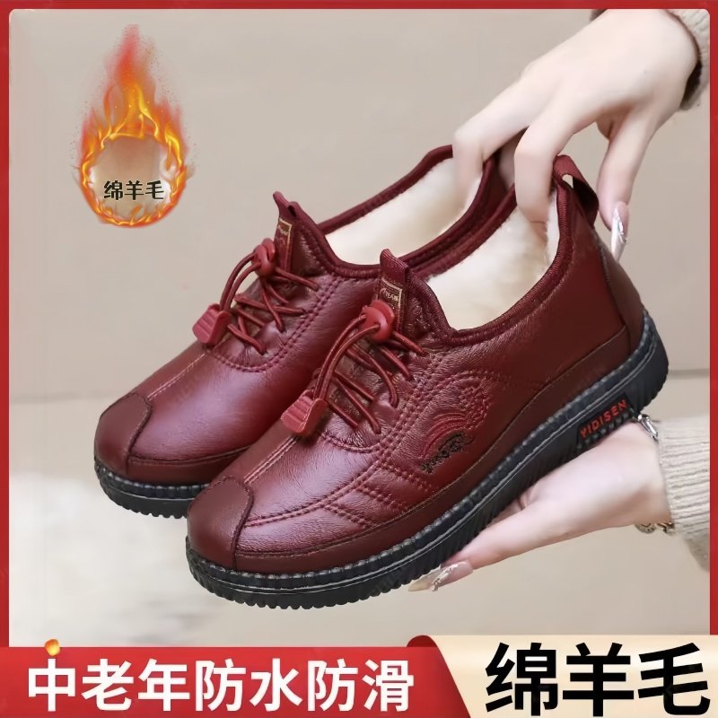 秋冬老北京布鞋女棉鞋皮面防水加绒保暖豆豆鞋防滑一脚蹬妈妈棉鞋