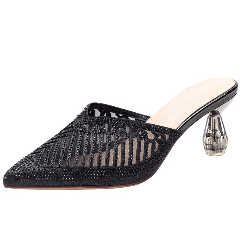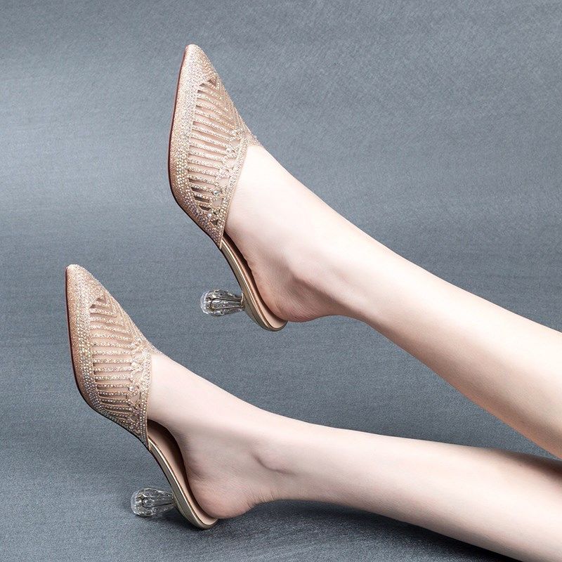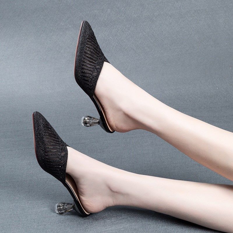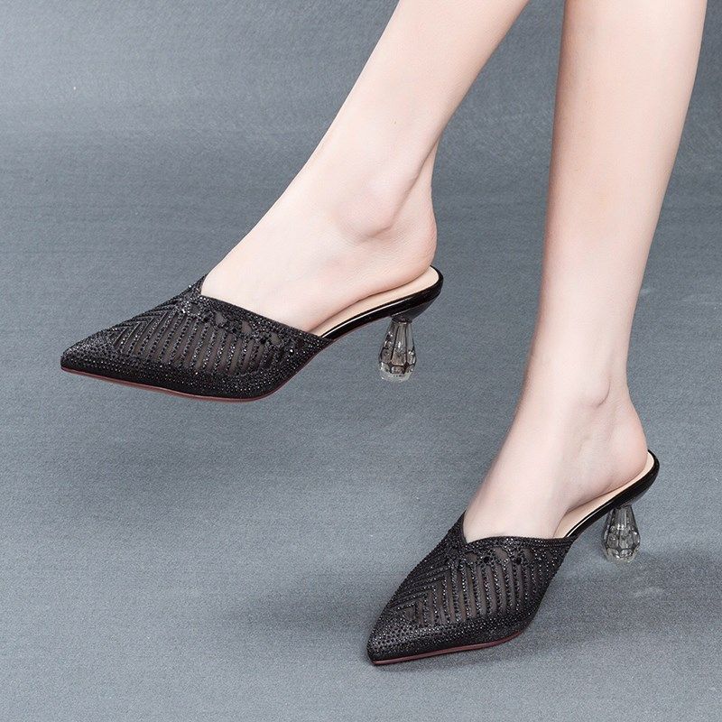 淘宝真皮夏季妈妈凉拖鞋女2023尖头粗跟外穿水钻半拖鞋网纱水晶高跟鞋