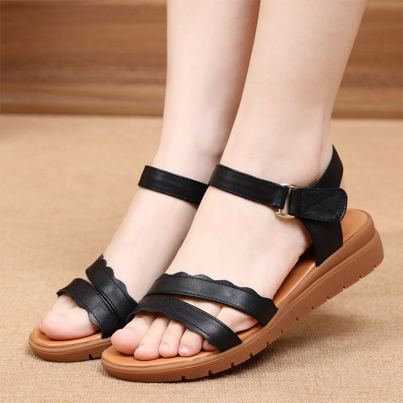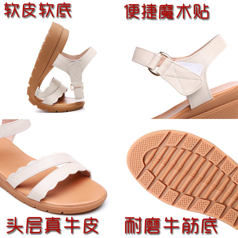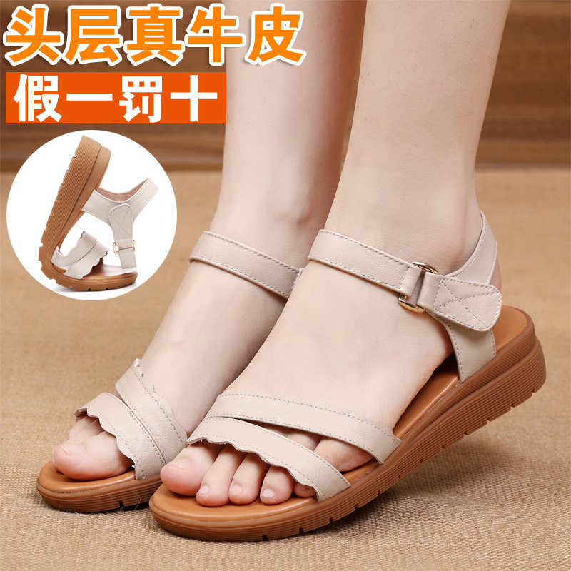 淘宝中年妈妈凉鞋女士鞋夏牛筋底平底防滑真皮软底中老年妇女式凉皮鞋