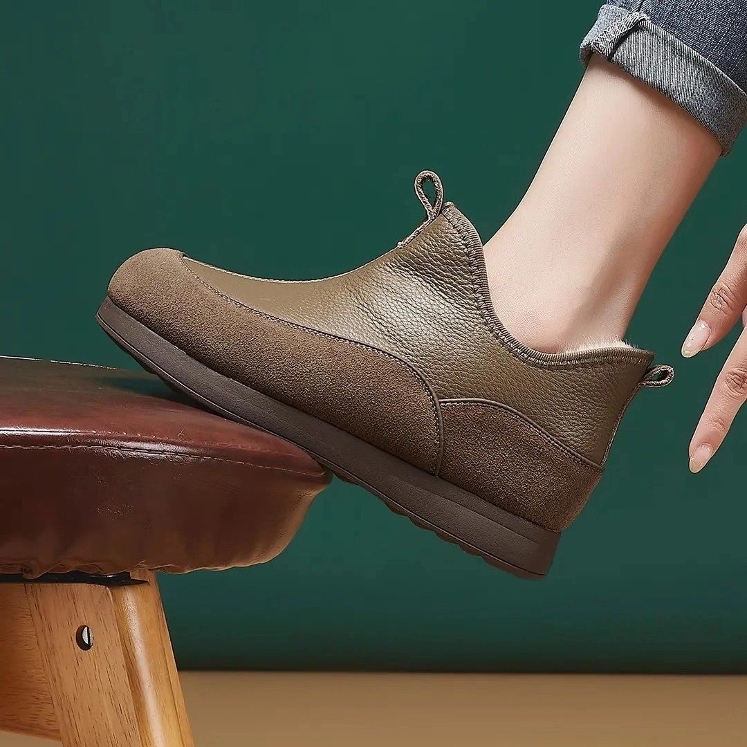 信诺真皮舒适女鞋秋冬新款加绒妈妈棉鞋中老年平底乐福鞋软底单鞋