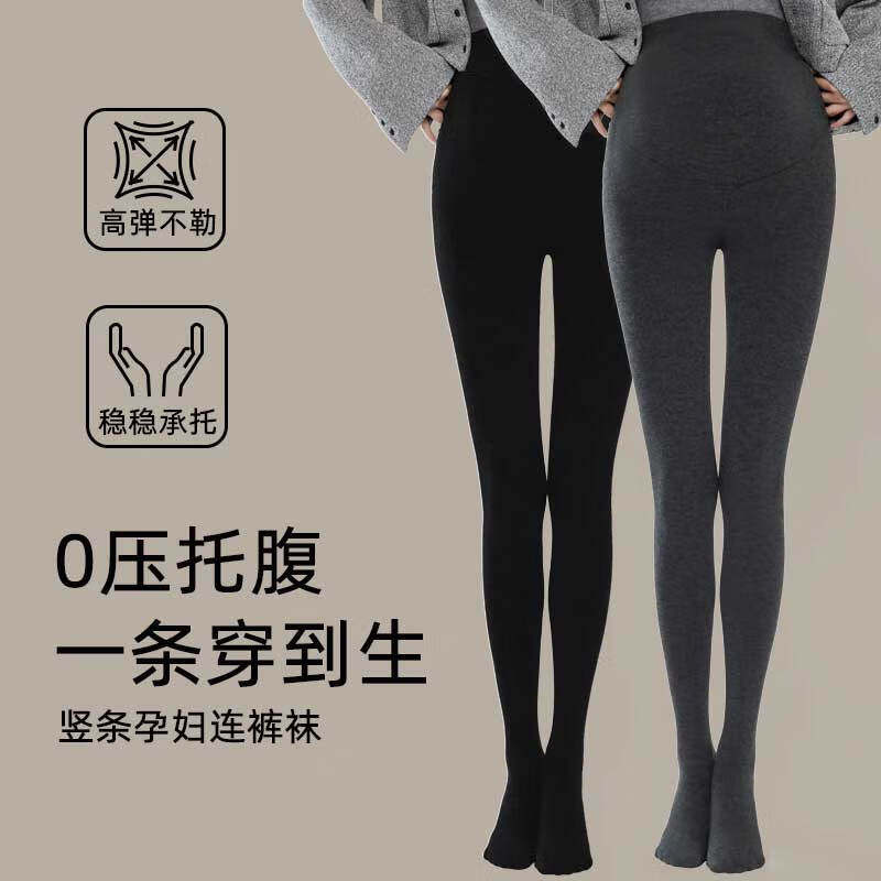 淘孕妇托腹裤打底裤袜春秋薄款棉竖条纹保暖可调节连裤袜不勒加绒