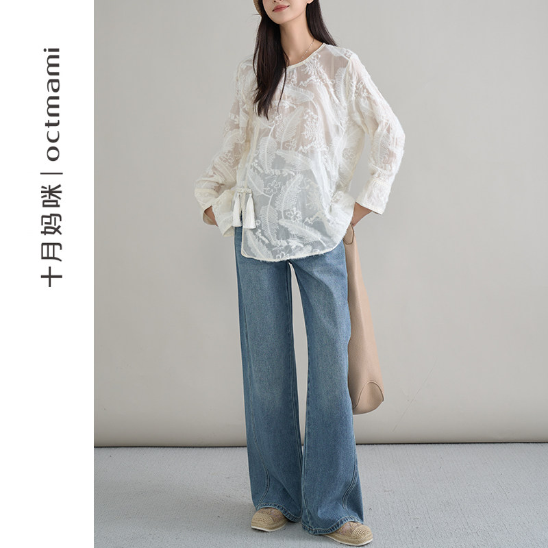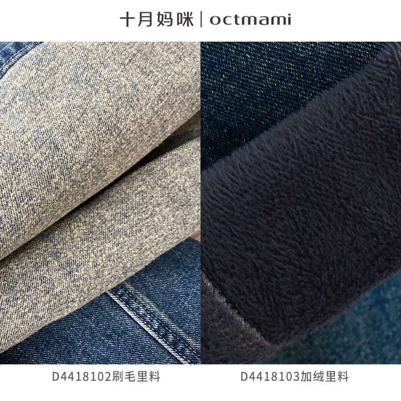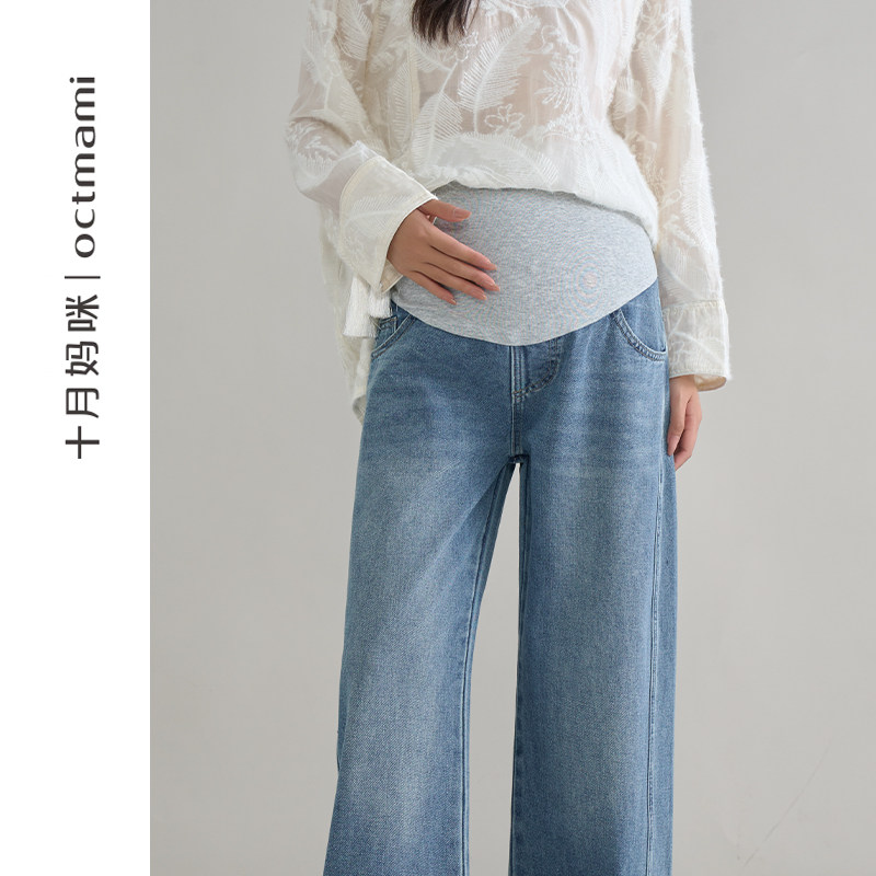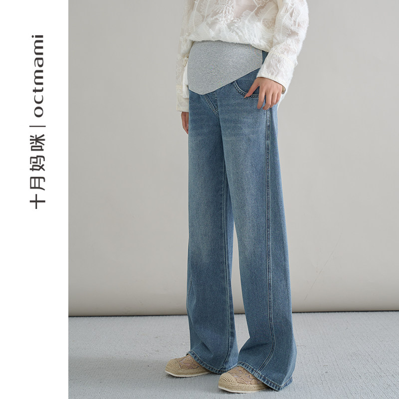 天猫十月妈咪孕妇牛仔镰刀直筒裤秋冬新款加绒外穿宽松托腹阔腿裤冬装