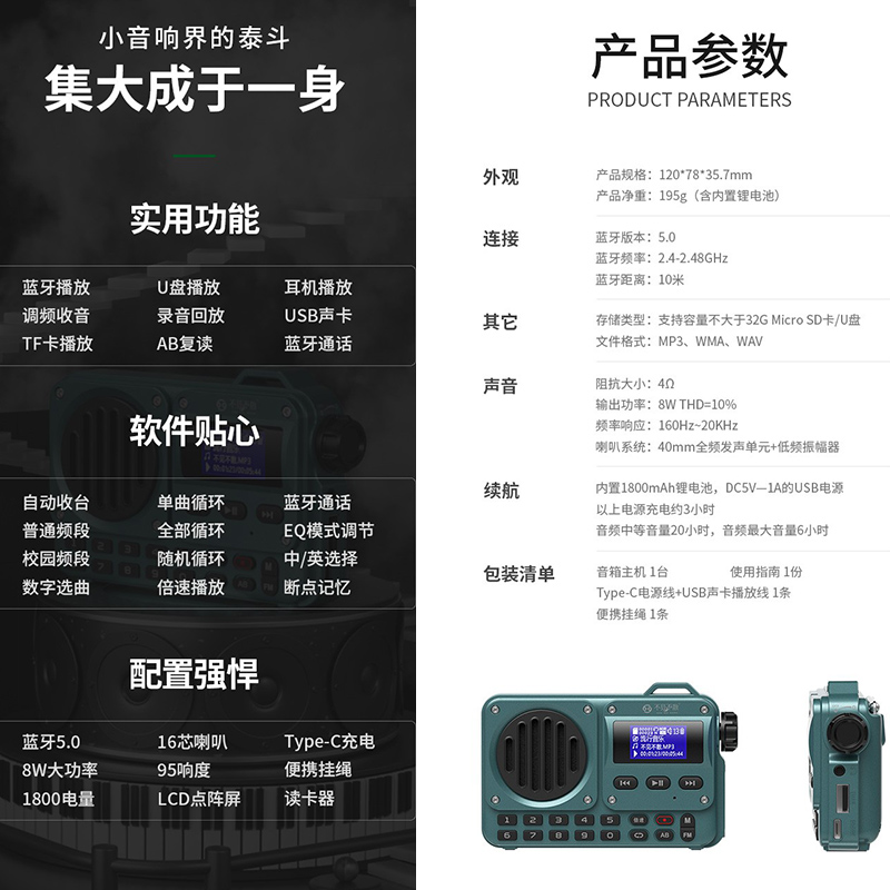 不见不散BV800是一款集蓝牙音箱、收音机、插卡播放于一体的便携式音响,适合老人、儿童及全家人使用。它支持蓝牙5.0无线连接,音质清晰洪亮,低音浑厚,带来沉浸式听觉体验。内置FM收音机功能,可自动搜台,方便收听新闻、戏曲等节目。支持TF卡、U盘播放,兼容MP3、WAV等多种音频格式,操作简单直观。特别配备倍速播放功能,满足语言学习或快速听书需求。机身轻便小巧,续航持久,配有手提带,户外出行携带方便。大按键设计,老人儿童也能轻松上手,是居家、旅行、晨练的理想伴侣。