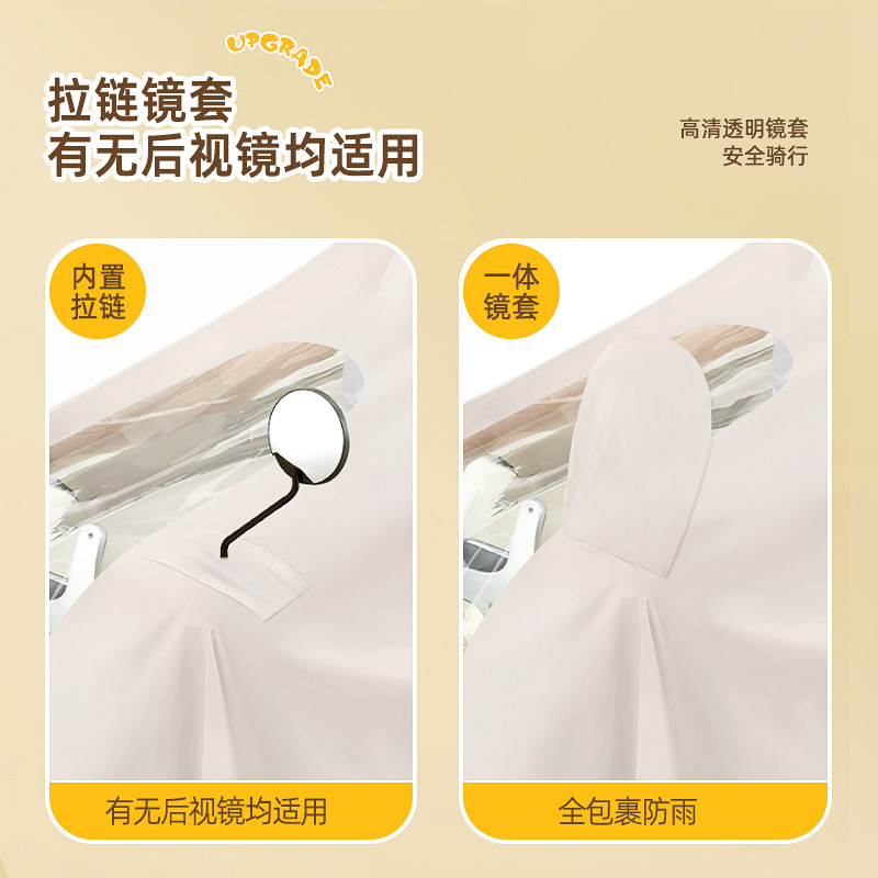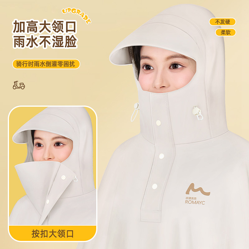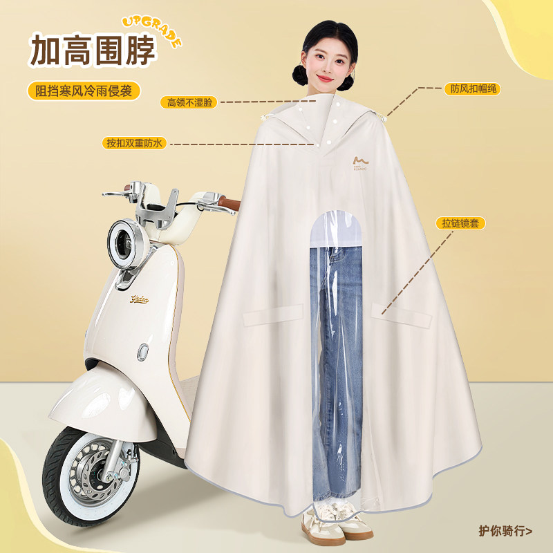 这款长款全身防暴雨披专为女性骑行设计,采用加厚防水面料,有效抵御暴雨侵袭,确保骑行时身体干爽舒适。加长版型覆盖全身及电动车前部,防止雨水渗入鞋子和车体,提升安全性和防护性。加大设计包容性强,适合不同体型成人穿着,活动自如不束缚。背部设有反光条,夜间骑行更安全。一体式帽檐设计,有效遮挡面部雨水,保持视线清晰。轻便易折叠,可随身携带,是雨天骑行的理想选择。无论是日常通勤还是短途出行,这款雨披都能为您提供全方位防护,让您无惧风雨,安心出行。