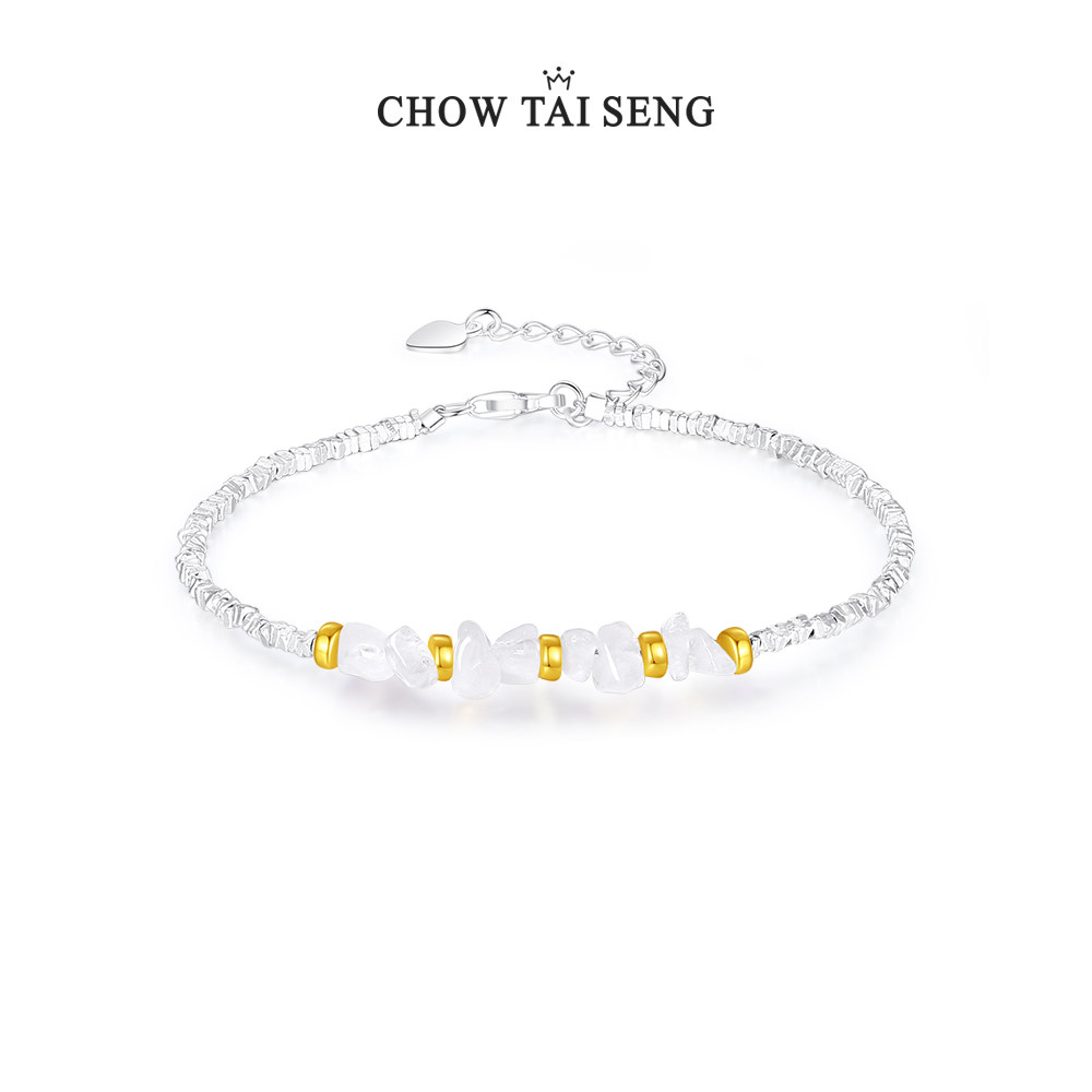 周大生碎银子紫水晶手链,融合国风美学与现代工艺,以纯银S925打造细腻链条,镶嵌温润白水晶与神秘紫水晶,搭配碎银点缀,层次丰富,尽显高级质感。紫水晶象征智慧与优雅,白水晶寓意纯净与能量,两者相映成趣,既显东方韵味,又具时尚气息。精工细作,佩戴舒适,适合日常搭配或重要场合。无论是自用还是作为生日礼物赠予挚爱,皆能传递心意与祝福,展现独特品味与高雅气质,是女性腕间不可多得的精致之选。