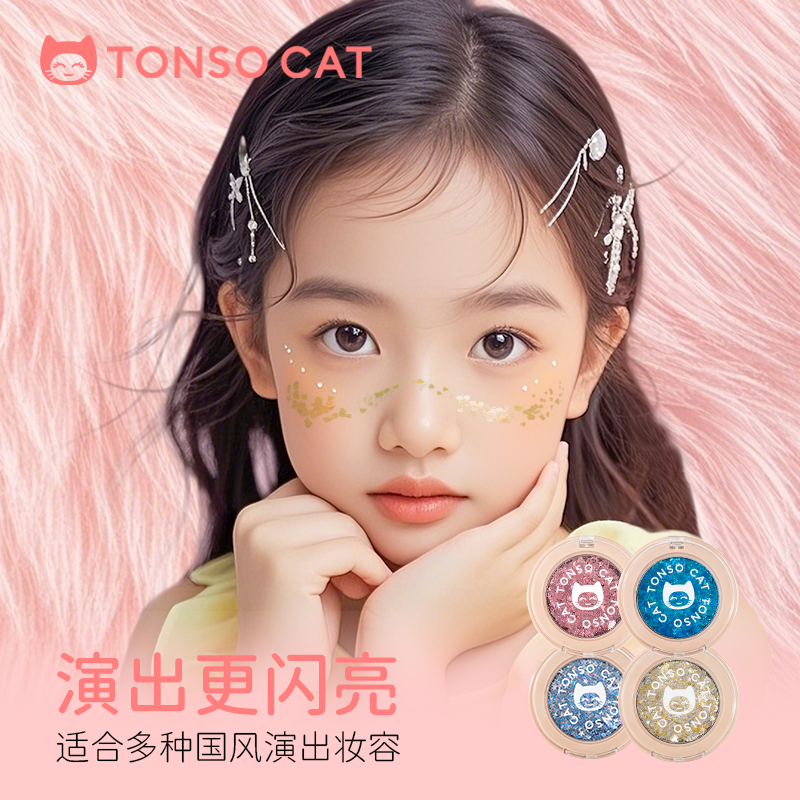TONSOCAT/童小喵儿童亮片眼影专为儿童舞台表演设计,安全温和,不含刺激性成分,通过皮肤测试,呵护宝宝娇嫩眼周肌肤。产品采用细腻亮片与珠光粉体,色彩绚丽、闪耀夺目,轻松打造梦幻舞台妆效,让孩子在舞台上自信闪耀。易上色、显色度高,且附着力强,持久不脱妆,满足长时间表演需求。包装可爱童趣,便于携带与使用,是儿童演出、节日庆典、才艺展示的必备彩妆单品。让每一次登台都成为孩子童年中最亮眼的时刻,安全又美丽,家长更放心。
