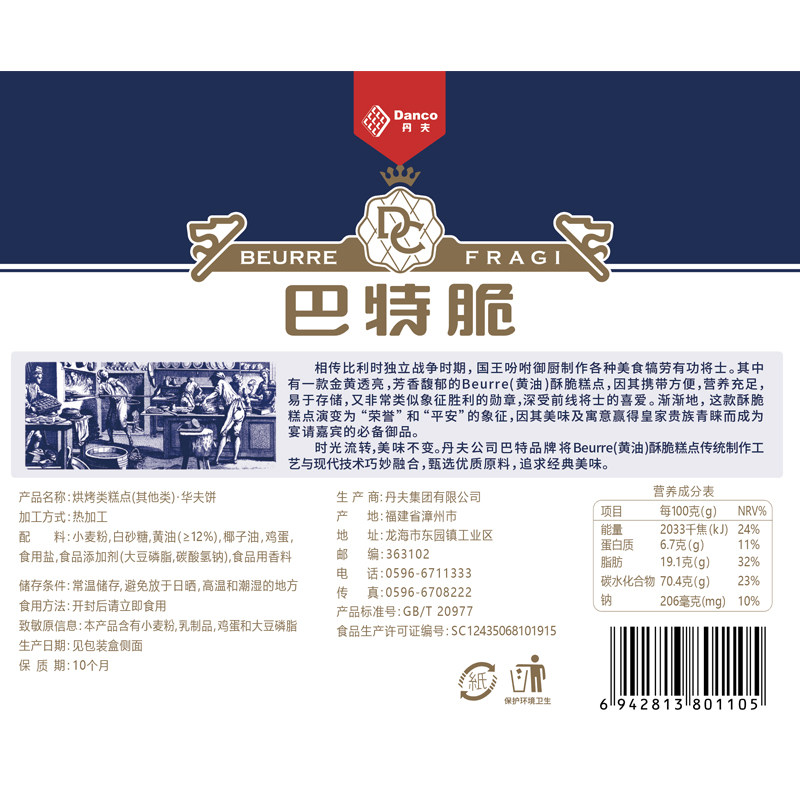 丹夫巴特脆黄油薄脆华夫饼干是一款风靡网络的网红零食,融合传统华夫工艺与现代酥脆口感。精选优质黄油与可可粉,经高温烘烤制成薄如蝉翼的酥脆饼体,外层轻裹浓郁巧克力,入口即化,奶香与巧克力香交织,层次丰富。每一片都呈现出精致的网格纹理,既美观又诱人。无论是搭配咖啡、下午茶,还是作为休闲零食,都能带来极致的味觉享受。独立小包装设计,方便携带,随时随地满足你的甜蜜渴望。这款奶油酥饼点心凭借其独特口感和高颜值,迅速成为社交平台上的爆款零食,是追求品质与美味并存的理想选择。