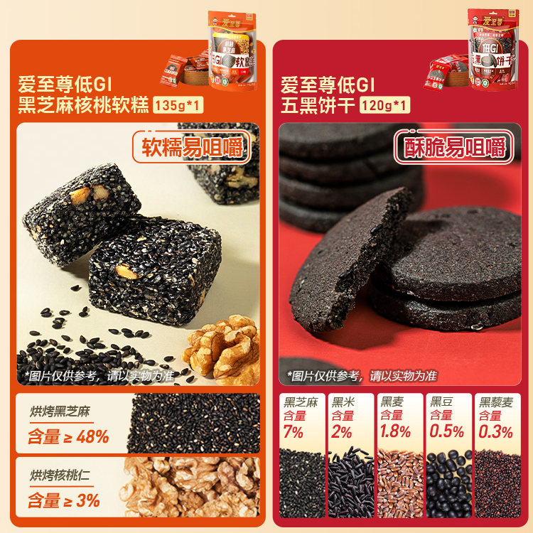 【林依轮直播间】倾情推荐——旺旺爱至尊低GI组合:五黑饼干&黑芝麻核桃软糕!专为健康控糖人群设计,采用低升糖指数(GI)配方,升糖更缓慢,饱腹更持久。五黑饼干融合黑芝麻、黑米、黑豆等五种黑色食材,营养密集,口感酥脆;黑芝麻核桃软糕则精选优质原料,软糯香甜,富含膳食纤维与不饱和脂肪酸。无添加蔗糖,兼顾美味与健康,适合日常代餐、办公零食或控糖人士加餐。旺旺品质保障,林依轮亲测推荐,吃得安心更放心。现在下单,享受直播间专属优惠,开启轻盈健康新“食”尚!