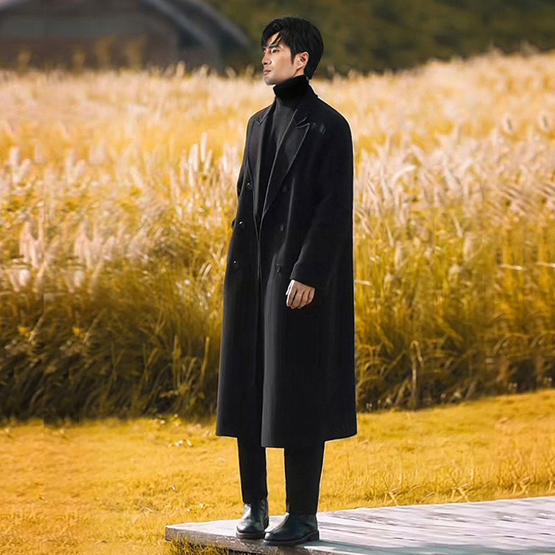 淘秋冬羊毛双面呢大衣男士垫肩超长款过膝西装领韩式毛呢子风衣外套