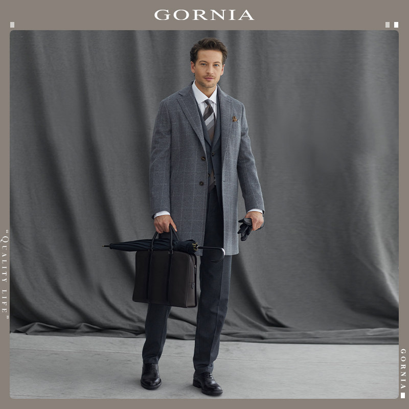 GORNIA(格罗尼雅)爵士羊绒大衣是一款兼具优雅与保暖的男士中长款毛呢外套,采用优质羊绒与精纺毛呢混纺面料,触感柔软、垂坠挺括。经典西装领设计,线条利落,搭配单排扣门襟,彰显都市绅士的沉稳气质。中长版型修饰身形,适合多种场合穿搭,无论是商务通勤还是休闲出行皆显品味。内衬做工精致,细节考究,兼顾舒适性与耐用性。GORNIA以匠心工艺融合现代剪裁,将奢华材质与实用功能完美结合,是冬季衣橱中不可或缺的时尚单品,演绎低调而高级的男士风尚。