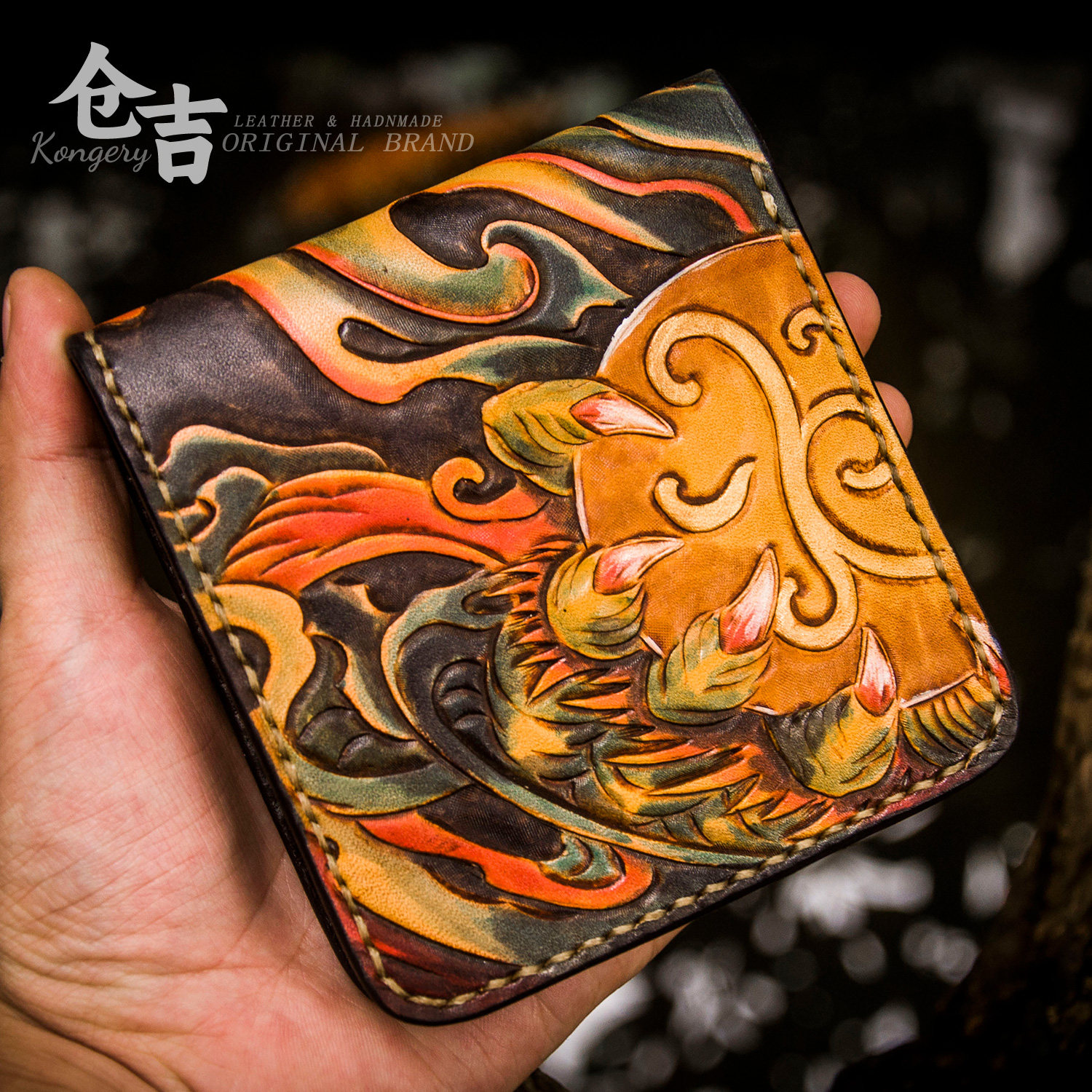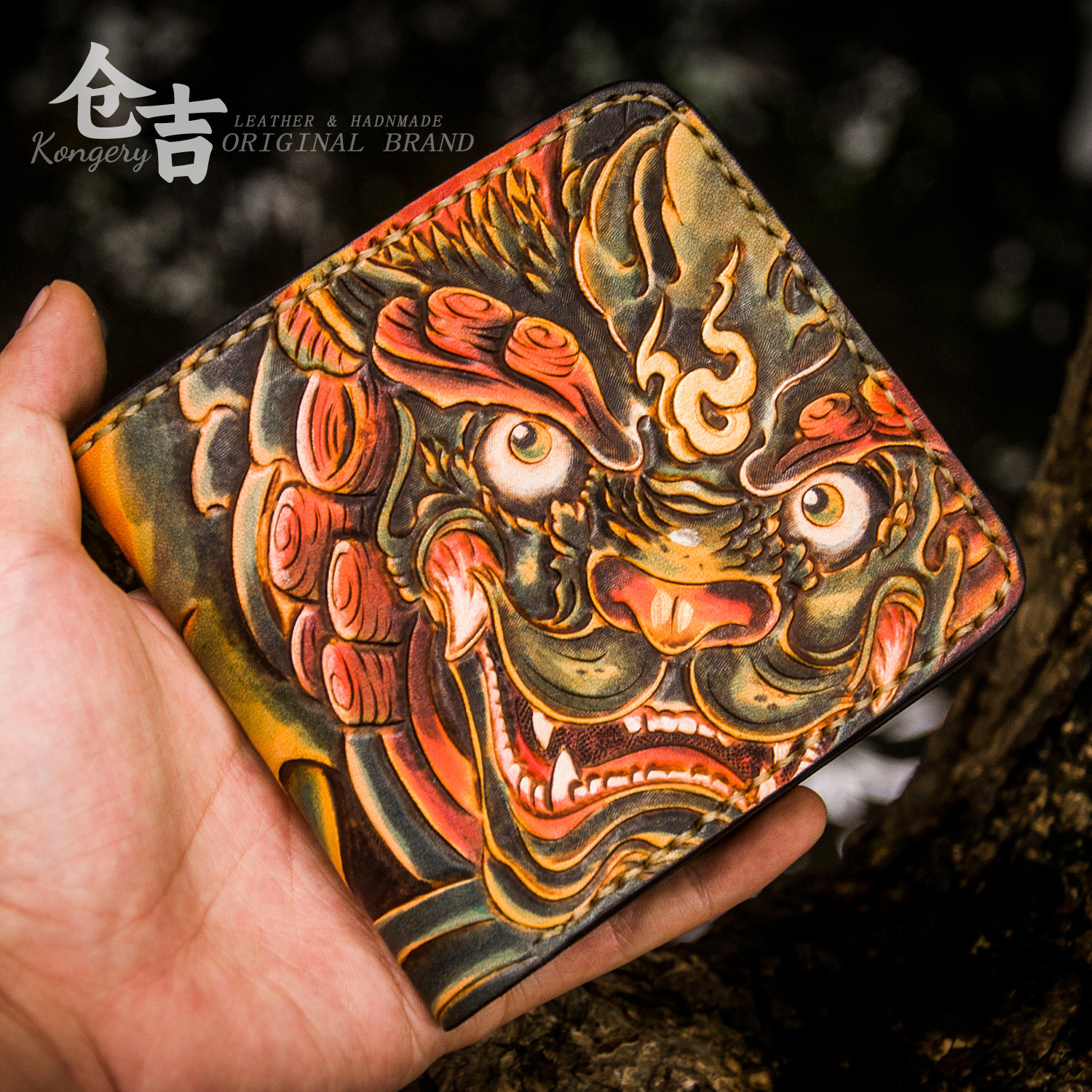 淘宝福狮献瑞!聚财!钱包男女短款钱夹皮雕唐狮民族风横款真牛皮卡包