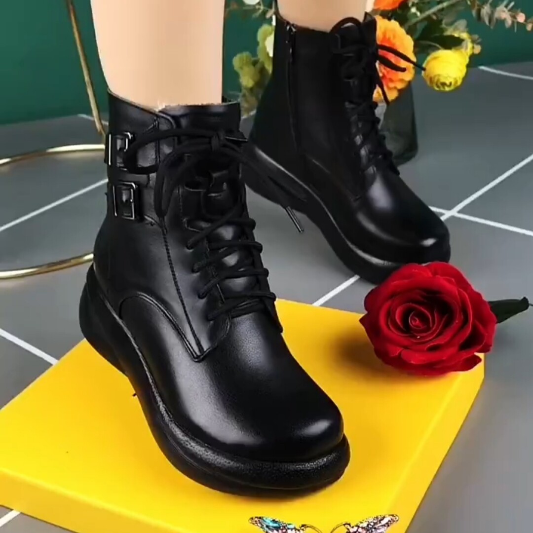2024年冬季新款厚底短靴,专为时尚妈妈打造,融合舒适与潮流。精选优质真皮材质,质感细腻,耐穿透气;内里加绒羊毛设计,保暖亲肤,适合寒冷季节。圆头造型宽松舒适,不挤脚,搭配软底厚底设计,轻盈减震,久走不累。经典马丁靴风格,休闲百搭,轻松驾驭日常出行、逛街或通勤。厚底增高显腿长,同时提升整体气场。无论是搭配牛仔裤、长裙还是大衣,都能展现优雅从容的女性魅力。这款真皮羊毛女靴,兼顾实用与美观,是冬季衣橱的必备单品,让妈妈们在寒冬中也能步履轻盈、自信出行。