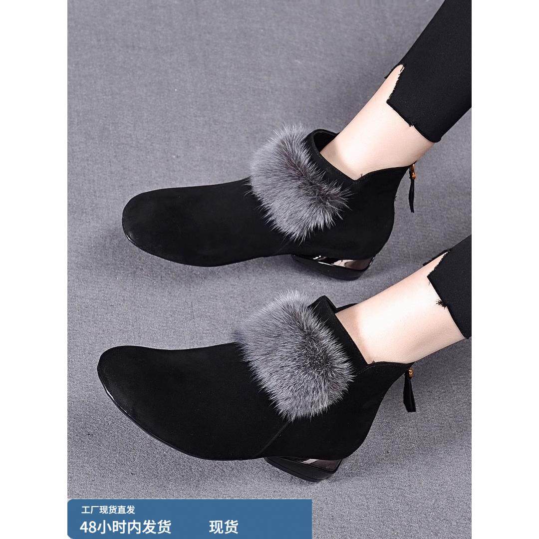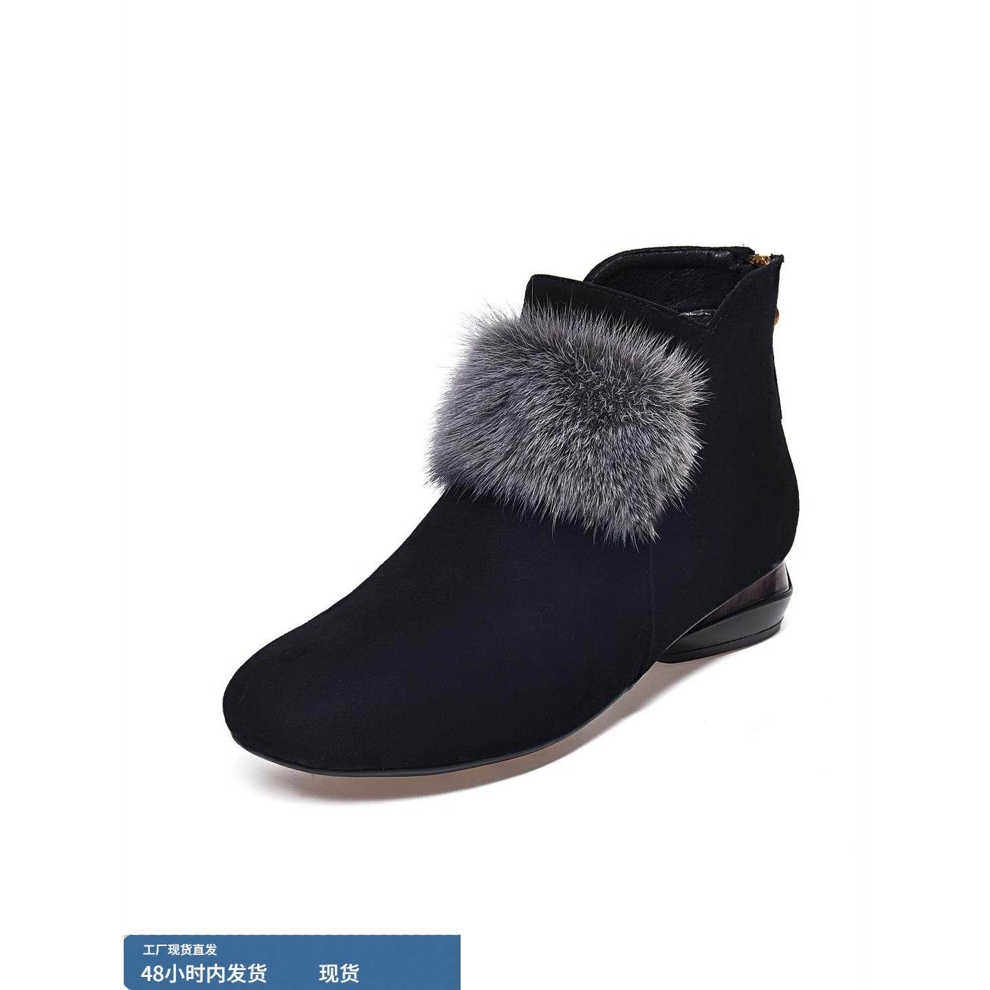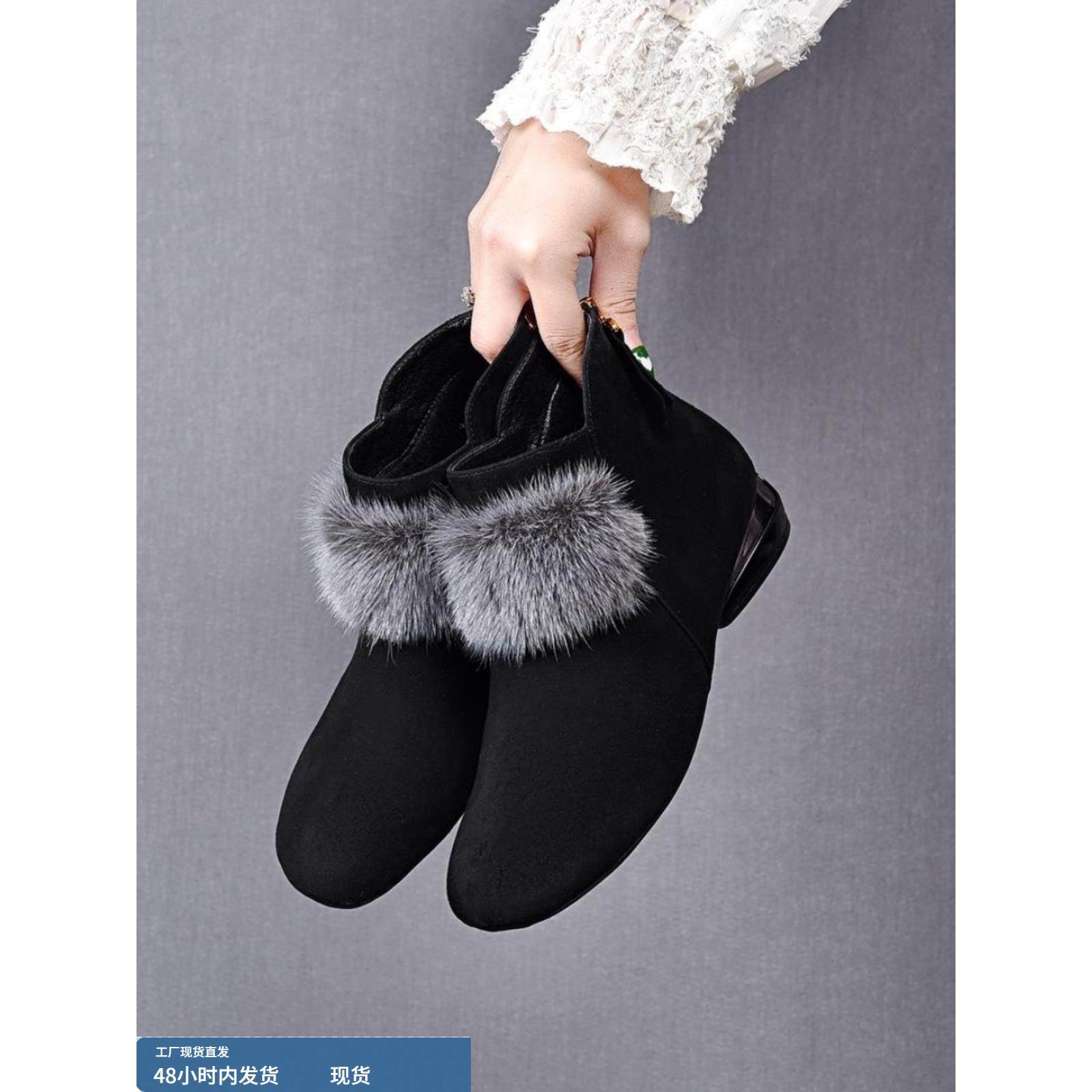 淘宝真皮磨砂皮水貂毛毛鞋圆头加绒低跟短靴女冬季新款平底防滑妈妈靴