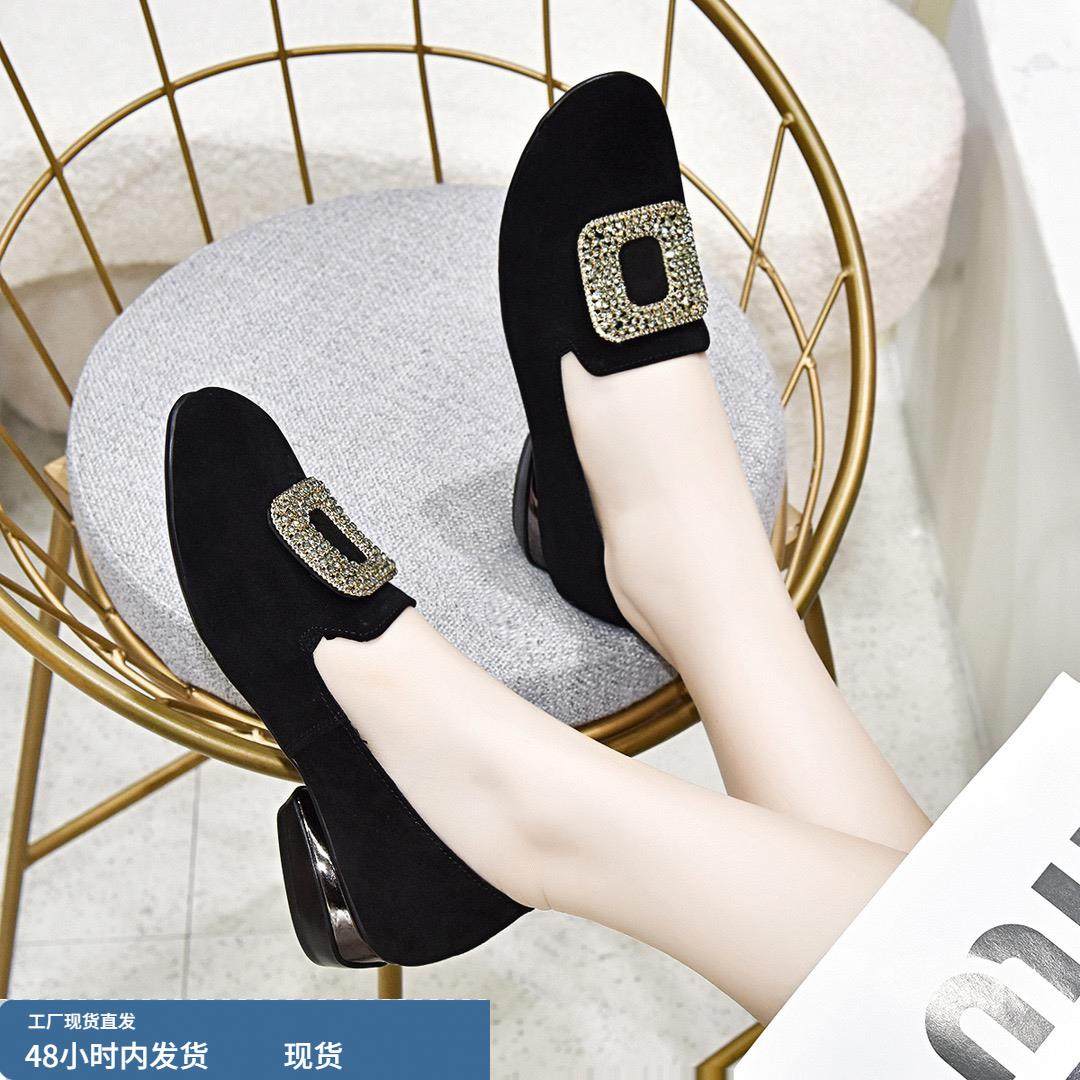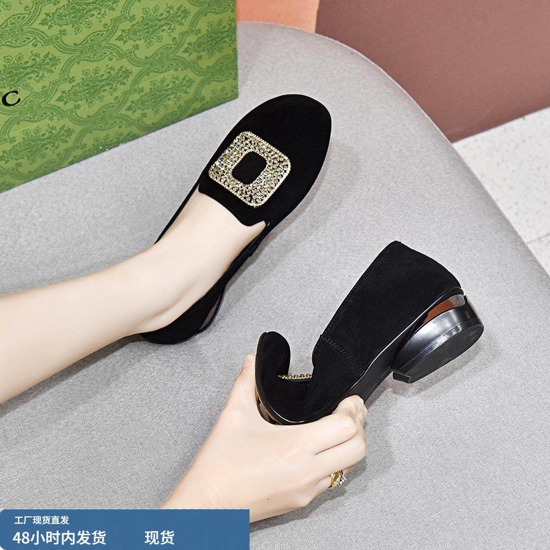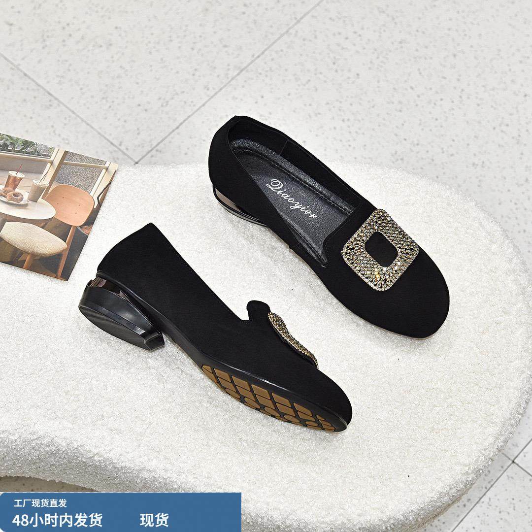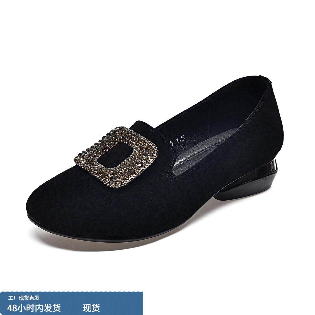 淘宝真皮圆头粗跟单鞋女2024春秋新款羊绒水钻软皮低跟一脚蹬妈妈鞋女