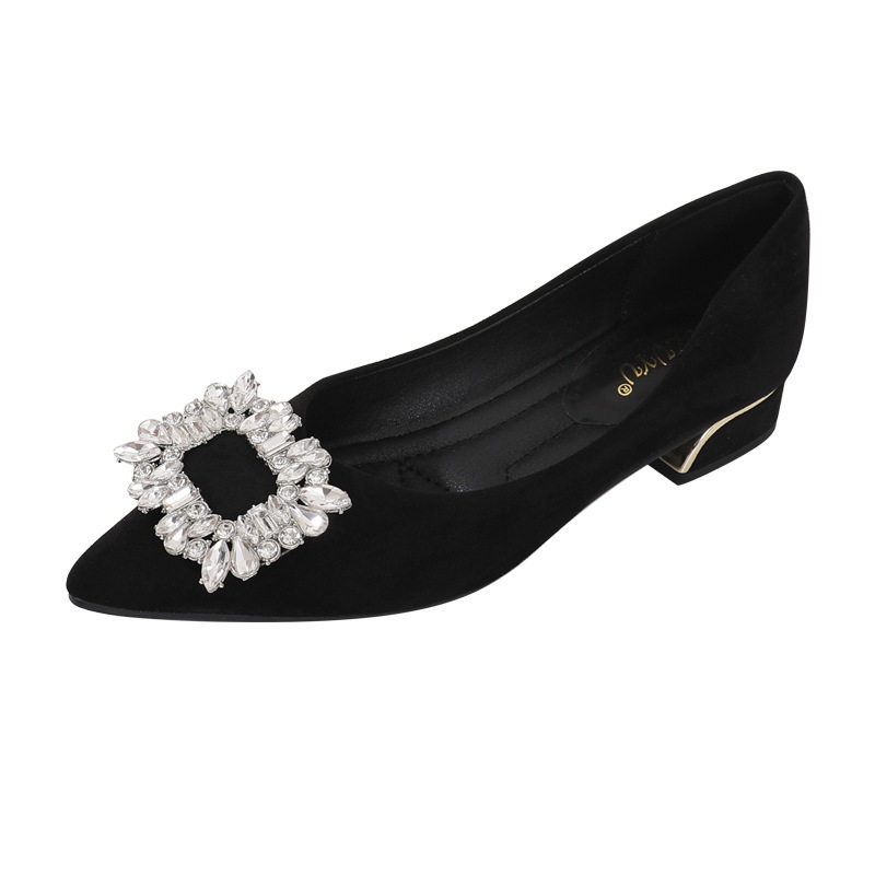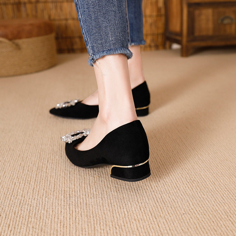 淘宝跨境外贸尖头粗跟单鞋女款2025冬季新款浅口妈妈鞋粗跟绒面女鞋子