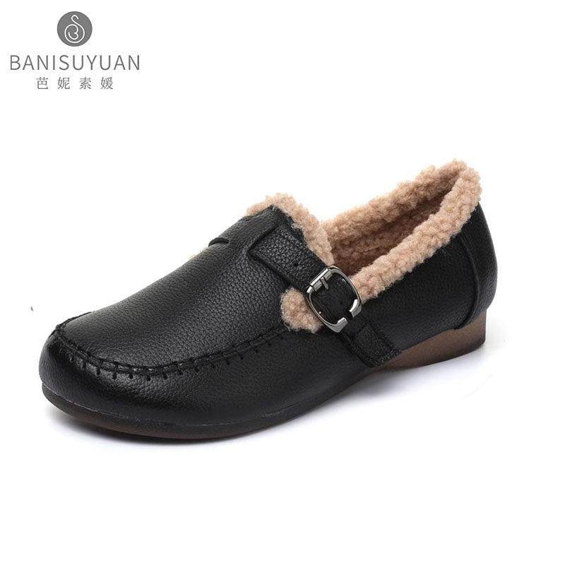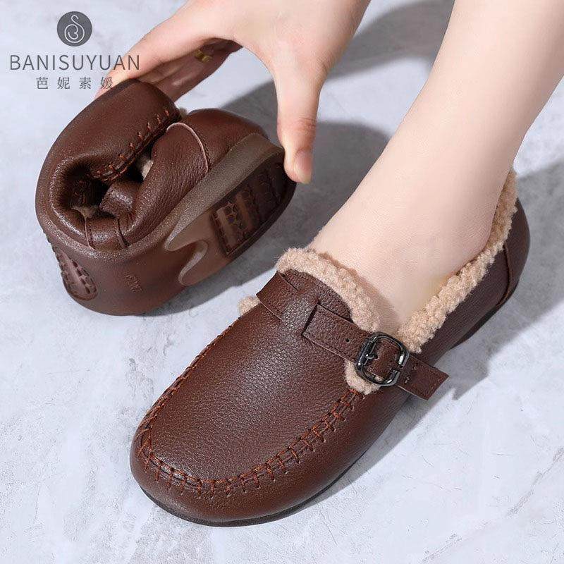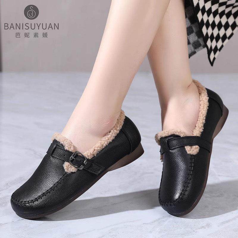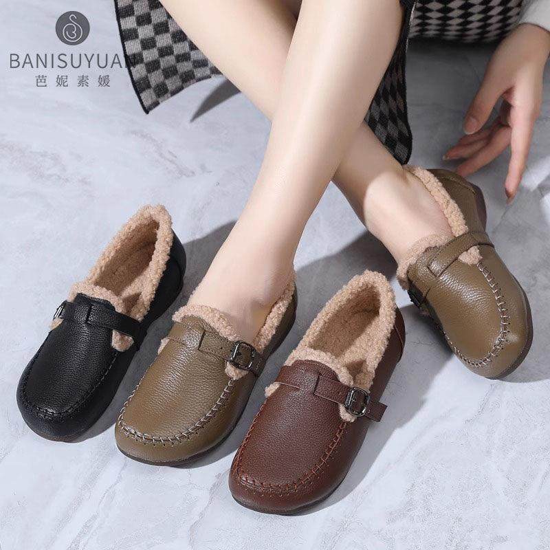 淘宝平底真皮单鞋女秋冬季2025新款外穿毛毛鞋软底加绒保暖妈妈棉鞋