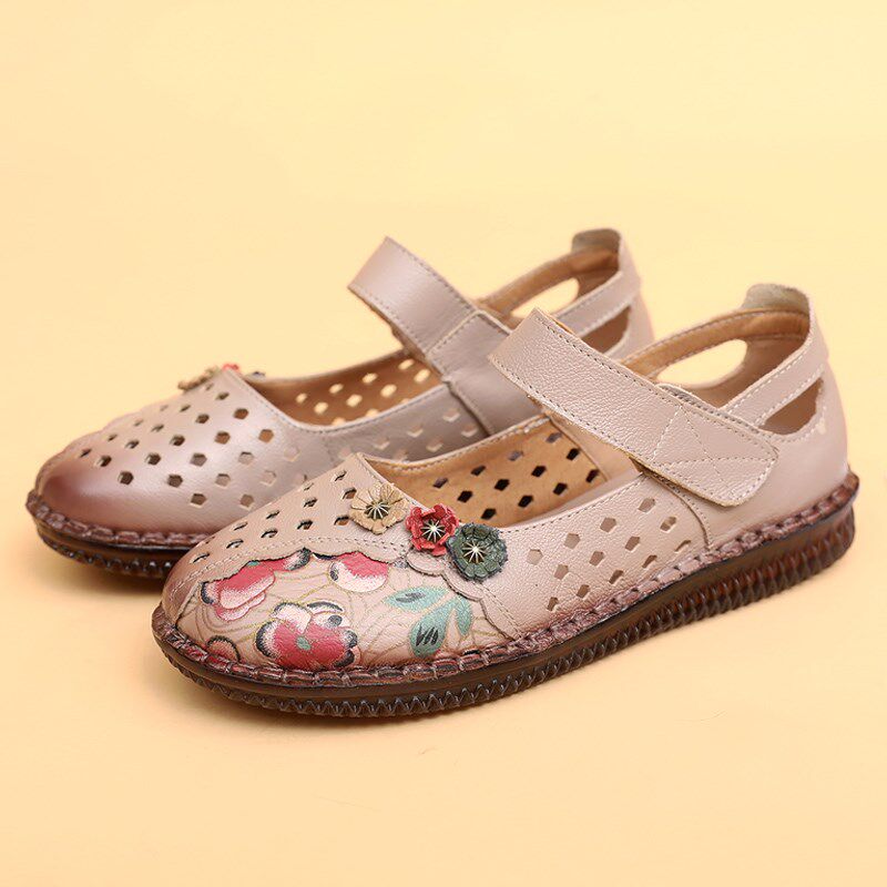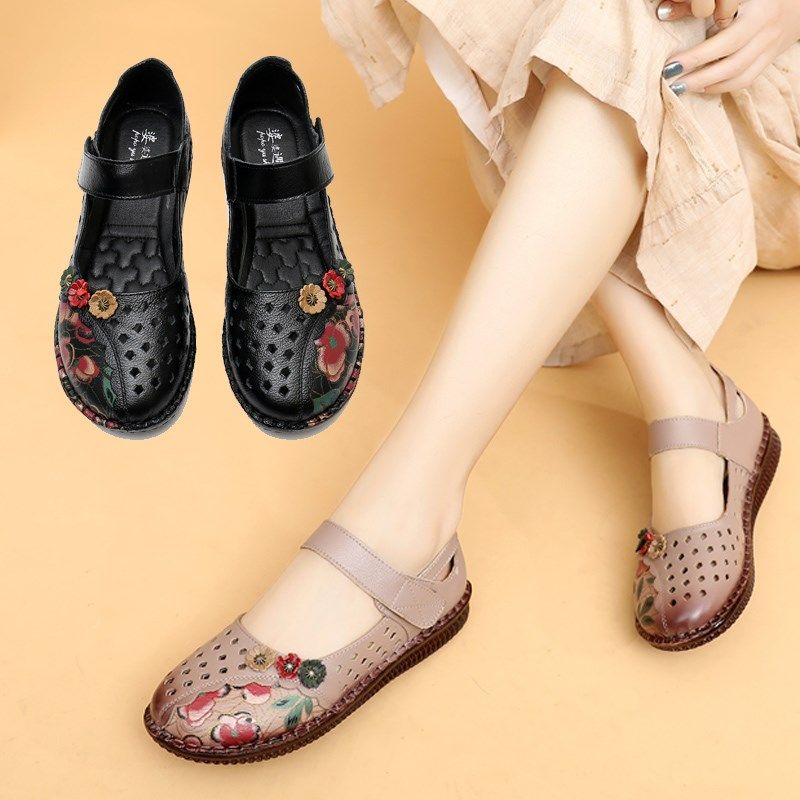 淘宝夏季单鞋真皮软底妈妈鞋中老年女鞋镂空老人皮鞋凉鞋平底洞洞鞋