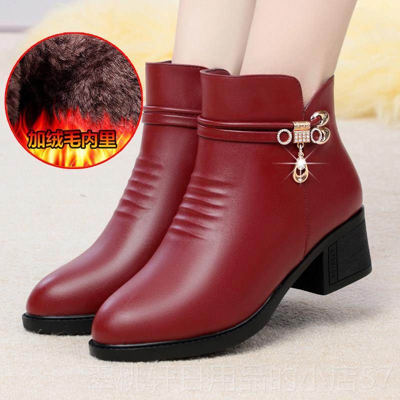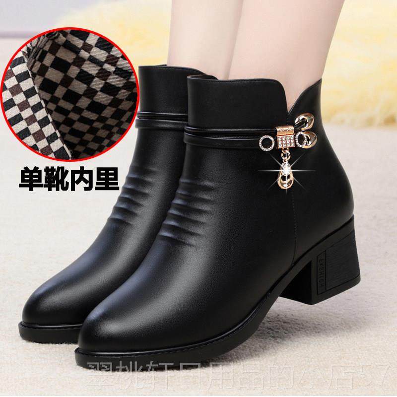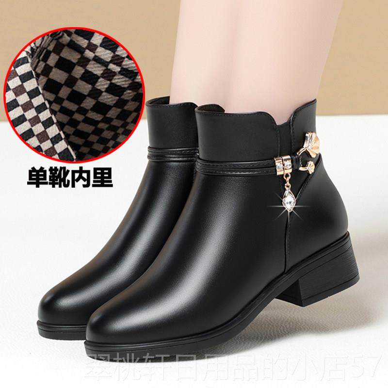 淘宝正品妈妈棉鞋中老年鞋真皮软底靴中跟单靴粗短靴秋子冬季防滑棉跟
