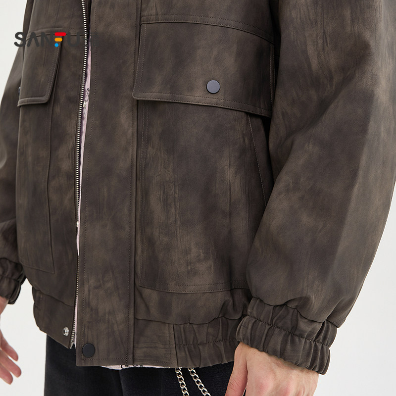 天猫三福2025冬季满版蜡染PU皮衣夹克男加绒复古大口袋宽松外套510052