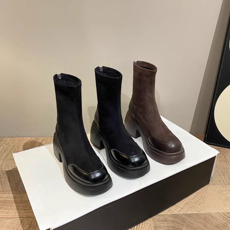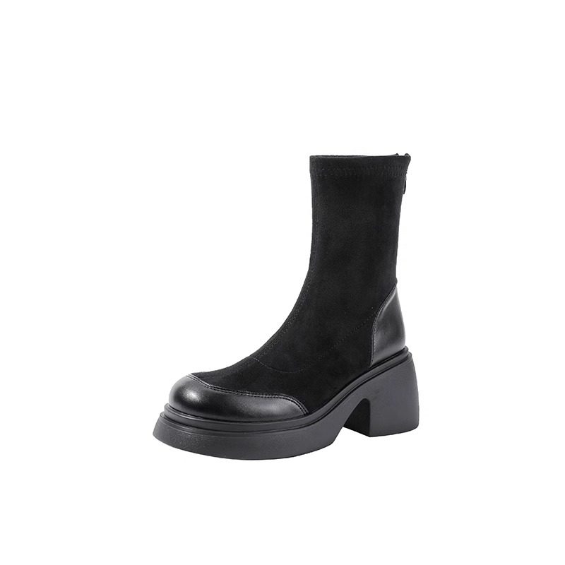 淘宝品牌真皮弹力袜靴女2024新款厚底小个子加绒瘦瘦粗跟高跟马丁短靴