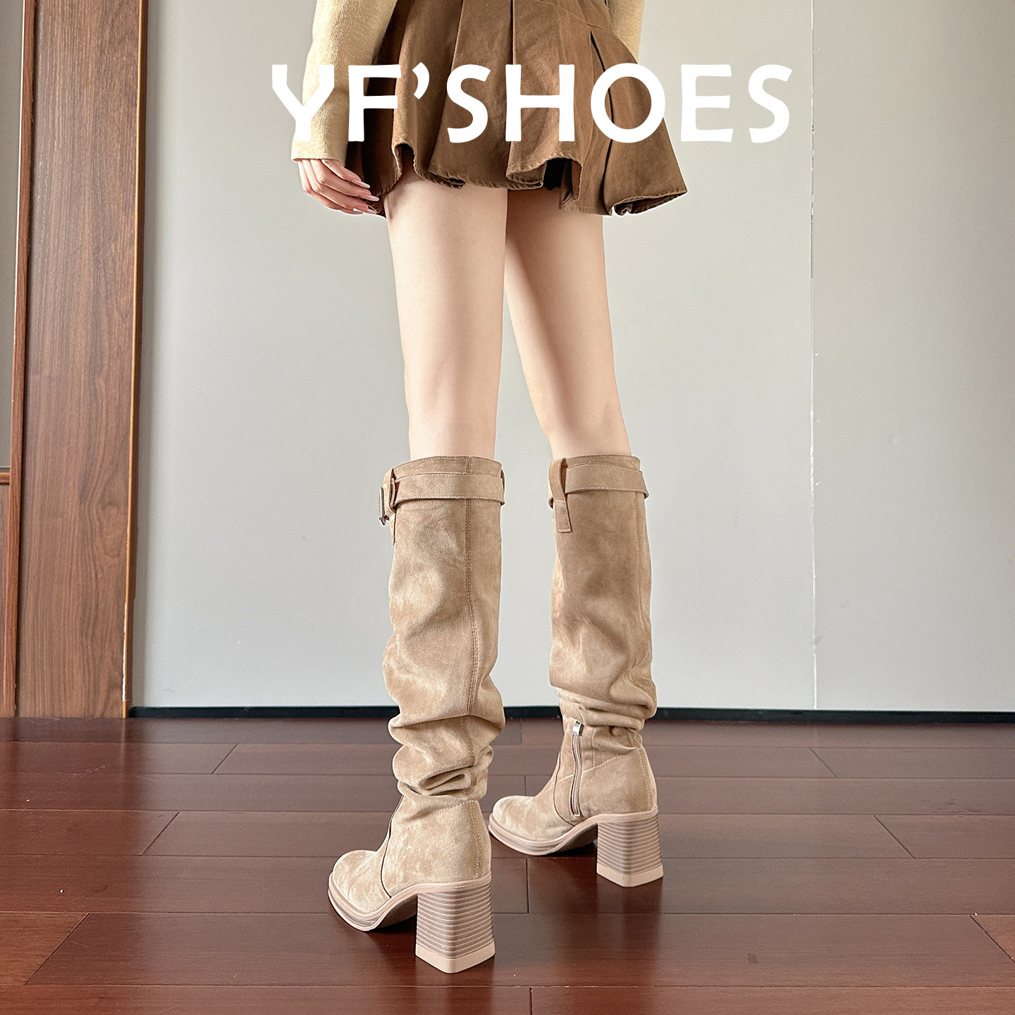 淘宝绒面复古堆堆靴长筒靴高跟显瘦粗跟高筒废土风棕色西部牛仔骑士靴