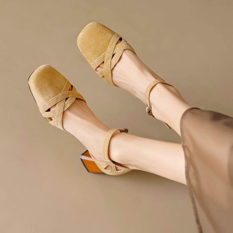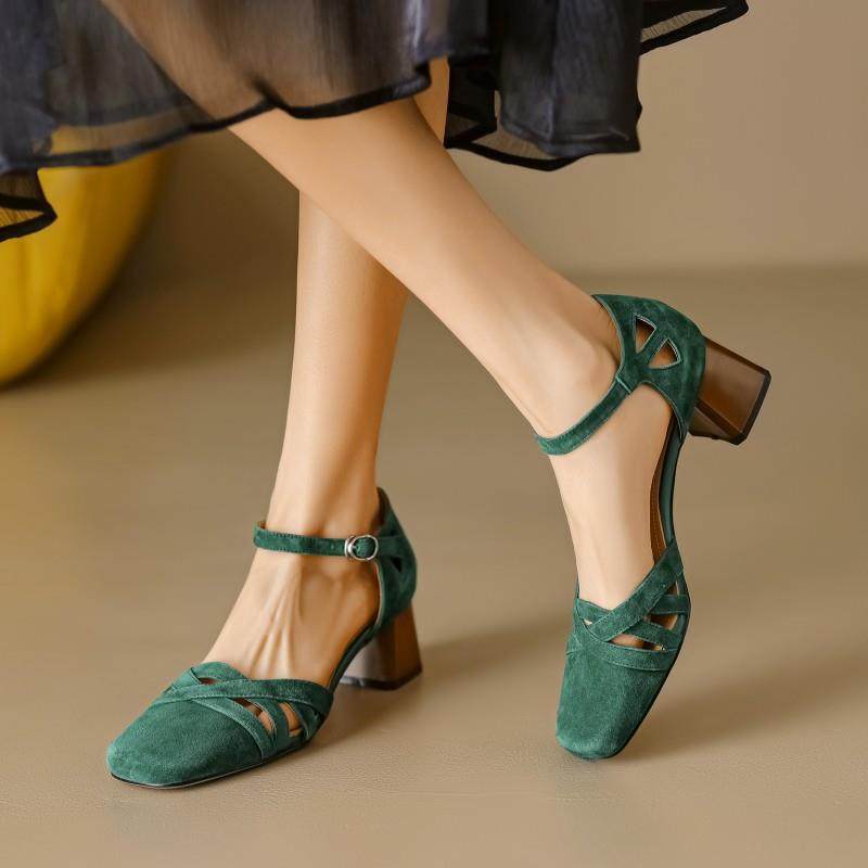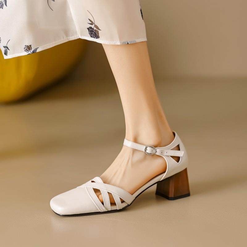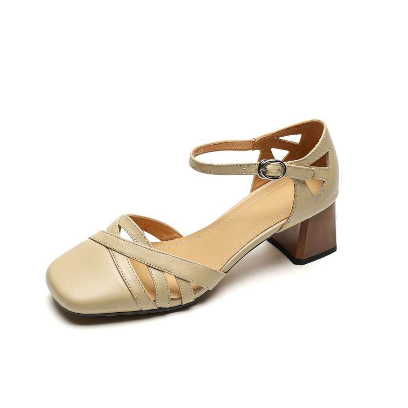 淘宝真皮法式复古镂空一字带包头罗马凉鞋百搭中空单鞋粗跟高跟鞋女夏